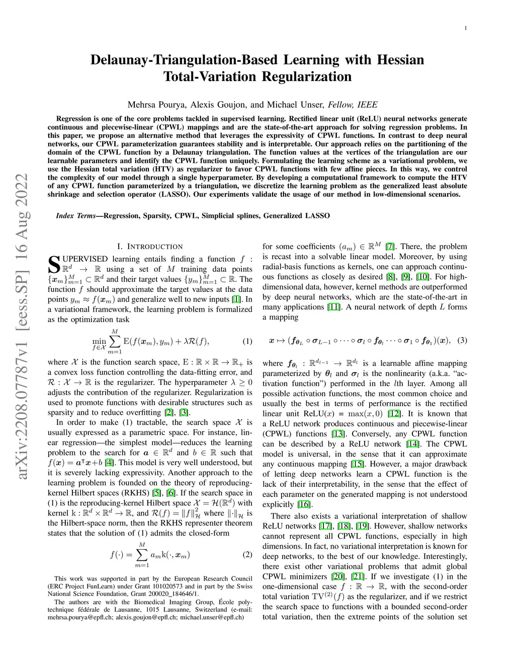 Regression is one of the core problems tackled in supervised learning. Rectified linear unit (ReLU) neural networks generate continuous and piecewise-linear (CPWL) mappings and are the state-of-the-art approach for solving regression problems. In this paper, we propose an alternative method that leverages the expressivity of CPWL functions. In contrast to deep neural networks, our CPWL parameterization guarantees stability and is interpretable. Our approach relies on the partitioning of the domain of the CPWL function by a Delaunay triangulation. The function values at the vertices of the triangulation are our learnable parameters and identify the CPWL function uniquely. Formulating the learning scheme as a variational problem, we use the Hessian total variation (HTV) as regularizer to favor CPWL functions with few affine pieces. In this way, we control the complexity of our model through a single hyperparameter. By developing a computational framework to compute the HTV of any CPWL function parameterized by a triangulation, we discretize the learning problem as the generalized least absolute shrinkage and selection operator (LASSO). Our experiments validate the usage of our method in low-dimensional scenarios.