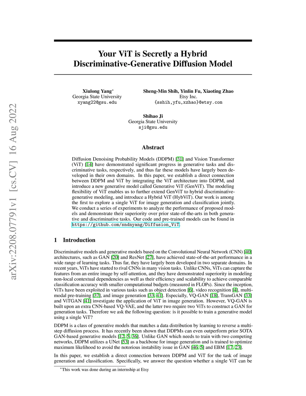 Diffusion Denoising Probability Models (DDPM) and Vision Transformer (ViT) have demonstrated significant progress in generative tasks and discriminative tasks, respectively, and thus far these models have largely been developed in their own domains. In this paper, we establish a direct connection between DDPM and ViT by integrating the ViT architecture into DDPM, and introduce a new generative model called Generative ViT (GenViT). The modeling flexibility of ViT enables us to further extend GenViT to hybrid discriminative-generative modeling, and introduce a Hybrid ViT (HybViT). Our work is among the first to explore a single ViT for image generation and classification jointly. We conduct a series of experiments to analyze the performance of proposed models and demonstrate their superiority over prior state-of-the-arts in both generative and discriminative tasks. Our code and pre-trained models can be found in https://github.com/sndnyang/Diffusion_ViT .