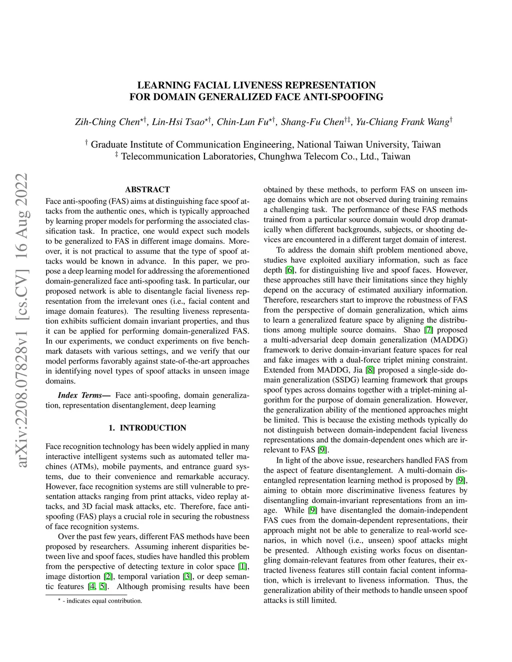 Face anti-spoofing (FAS) aims at distinguishing face spoof attacks from the authentic ones, which is typically approached by learning proper models for performing the associated classification task. In practice, one would expect such models to be generalized to FAS in different image domains. Moreover, it is not practical to assume that the type of spoof attacks would be known in advance. In this paper, we propose a deep learning model for addressing the aforementioned domain-generalized face anti-spoofing task. In particular, our proposed network is able to disentangle facial liveness representation from the irrelevant ones (i.e., facial content and image domain features). The resulting liveness representation exhibits sufficient domain invariant properties, and thus it can be applied for performing domain-generalized FAS. In our experiments, we conduct experiments on five benchmark datasets with various settings, and we verify that our model performs favorably against state-of-the-art approaches in identifying novel types of spoof attacks in unseen image domains.