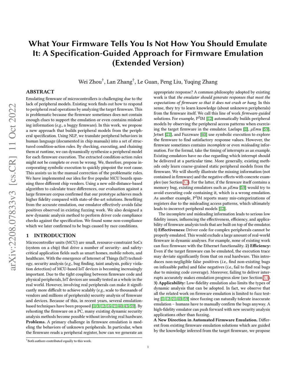 Emulating firmware of microcontrollers is challenging due to the lack of peripheral models. Existing work finds out how to respond to peripheral read operations by analyzing the target firmware. This is problematic because the firmware sometimes does not contain enough clues to support the emulation or even contains misleading information (e.g. buggy firmware). In this work, we propose a new approach that builds peripheral models from the peripheral specification. Using NLP, we translate peripheral behaviors in human language (documented in chip manuals) into a set of structured condition-action rules. By checking, executing, and chaining them at runtime, we can dynamically synthesize a peripheral model for each firmware execution. The extracted condition-action rules might not be complete or even be wrong. We, therefore, propose incorporating symbolic execution to quickly pinpoint the root cause. This assists us in the manual correction of the problematic rules. We have implemented our idea for five popular MCU boards spanning three different chip vendors. Using a new edit-distance-based algorithm to calculate trace differences, our evaluation against a large firmware corpus confirmed that our prototype achieves much higher fidelity compared with state-of-the-art solutions. Benefiting from the accurate emulation, our emulator effectively avoids false positives observed in existing fuzzing work. We also designed a new dynamic analysis method to perform driver code compliance checks against the specification. We found some non-compliance which we later confirmed to be bugs caused by race conditions.