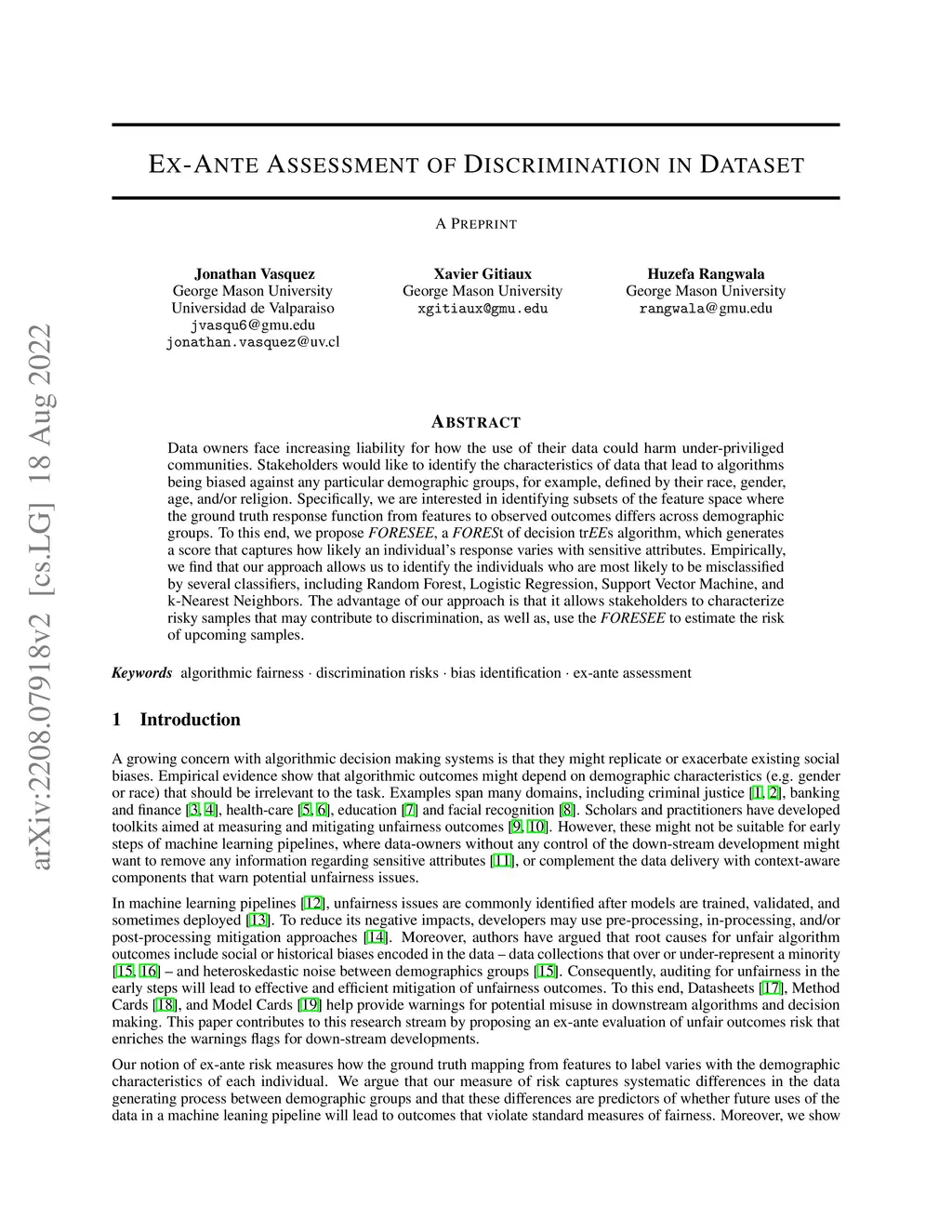 Data owners face increasing liability for how the use of their data could harm under-priviliged communities. Stakeholders would like to identify the characteristics of data that lead to algorithms being biased against any particular demographic groups, for example, defined by their race, gender, age, and/or religion. Specifically, we are interested in identifying subsets of the feature space where the ground truth response function from features to observed outcomes differs across demographic groups. To this end, we propose FORESEE, a FORESt of decision trEEs algorithm, which generates a score that captures how likely an individual's response varies with sensitive attributes. Empirically, we find that our approach allows us to identify the individuals who are most likely to be misclassified by several classifiers, including Random Forest, Logistic Regression, Support Vector Machine, and k-Nearest Neighbors. The advantage of our approach is that it allows stakeholders to characterize risky samples that may contribute to discrimination, as well as, use the FORESEE to estimate the risk of upcoming samples.