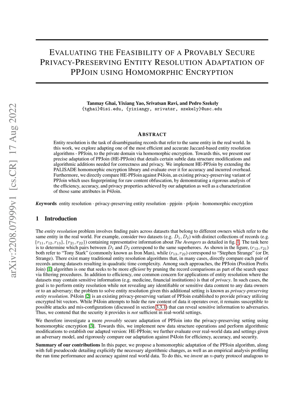 Entity Resolution Adaptation of PPJoin using Homomorphic Encryption