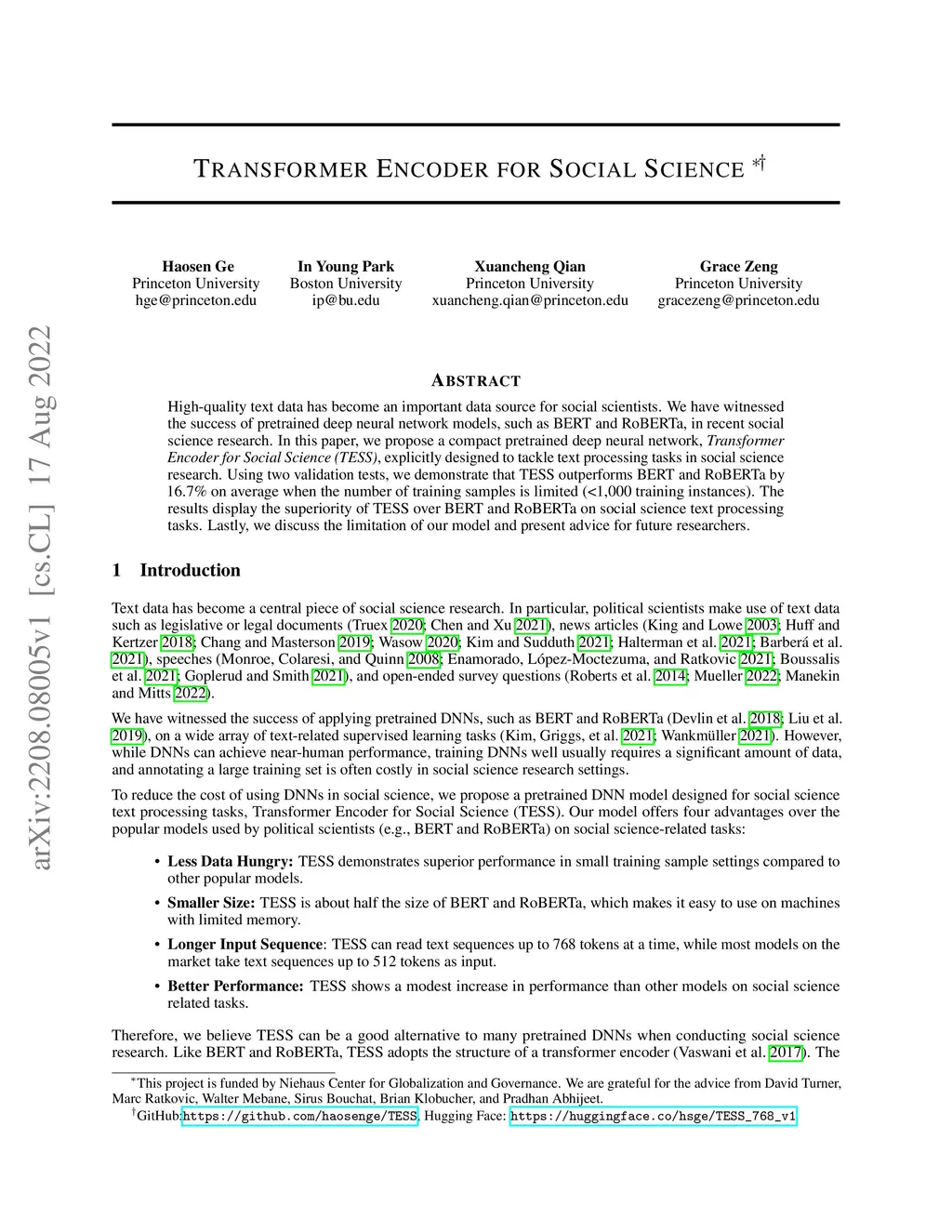 High-quality text data has become an important data source for social scientists. We have witnessed the success of pretrained deep neural network models, such as BERT and RoBERTa, in recent social science research. In this paper, we propose a compact pretrained deep neural network, Transformer Encoder for Social Science (TESS), explicitly designed to tackle text processing tasks in social science research. Using two validation tests, we demonstrate that TESS outperforms BERT and RoBERTa by 16.7% on average when the number of training samples is limited (<1,000 training instances). The results display the superiority of TESS over BERT and RoBERTa on social science text processing tasks. Lastly, we discuss the limitation of our model and present advice for future researchers.
