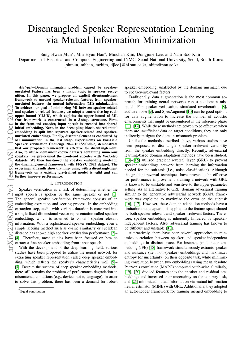 Domain mismatch problem caused by speaker-unrelated feature has been a major topic in speaker recognition. In this paper, we propose an explicit disentanglement framework to unravel speaker-relevant features from speaker-unrelated features via mutual information (MI) minimization. To achieve our goal of minimizing MI between speaker-related and speaker-unrelated features, we adopt a contrastive log-ratio upper bound (CLUB), which exploits the upper bound of MI. Our framework is constructed in a 3-stage structure. First, in the front-end encoder, input speech is encoded into shared initial embedding. Next, in the decoupling block, shared initial embedding is split into separate speaker-related and speaker-unrelated embeddings. Finally, disentanglement is conducted by MI minimization in the last stage. Experiments on Far-Field Speaker Verification Challenge 2022 (FFSVC2022) demonstrate that our proposed framework is effective for disentanglement. Also, to utilize domain-unknown datasets containing numerous speakers, we pre-trained the front-end encoder with VoxCeleb datasets. We then fine-tuned the speaker embedding model in the disentanglement framework with FFSVC 2022 dataset. The experimental results show that fine-tuning with a disentanglement framework on a existing pre-trained model is valid and can further improve performance.