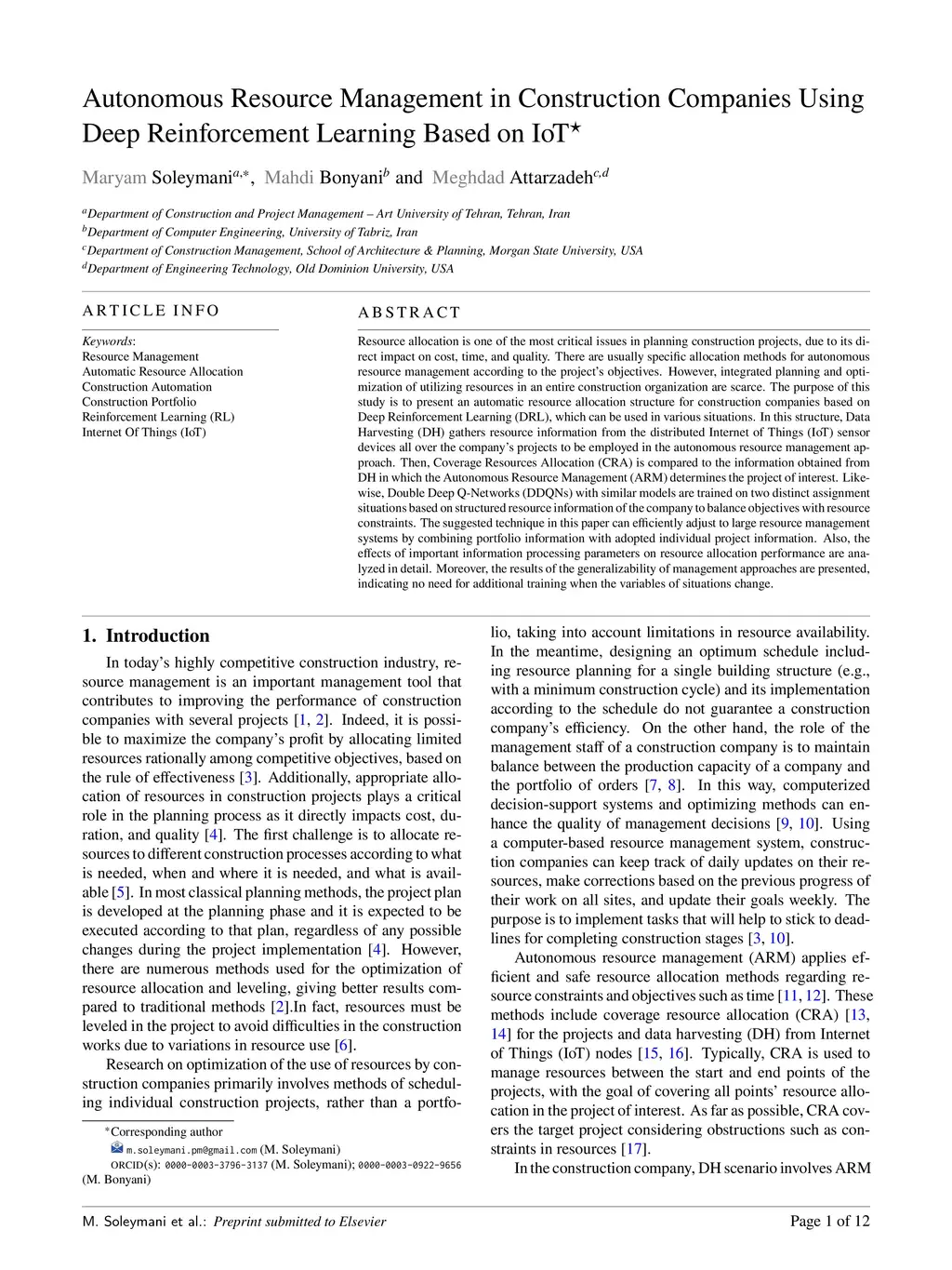 Resource allocation is one of the most critical issues in planning construction projects, due to its direct impact on cost, time, and quality. There are usually specific allocation methods for autonomous resource management according to the projects objectives. However, integrated planning and optimization of utilizing resources in an entire construction organization are scarce. The purpose of this study is to present an automatic resource allocation structure for construction companies based on Deep Reinforcement Learning (DRL), which can be used in various situations. In this structure, Data Harvesting (DH) gathers resource information from the distributed Internet of Things (IoT) sensor devices all over the companys projects to be employed in the autonomous resource management approach. Then, Coverage Resources Allocation (CRA) is compared to the information obtained from DH in which the Autonomous Resource Management (ARM) determines the project of interest. Likewise, Double Deep Q-Networks (DDQNs) with similar models are trained on two distinct assignment situations based on structured resource information of the company to balance objectives with resource constraints. The suggested technique in this paper can efficiently adjust to large resource management systems by combining portfolio information with adopted individual project information. Also, the effects of important information processing parameters on resource allocation performance are analyzed in detail. Moreover, the results of the generalizability of management approaches are presented, indicating no need for additional training when the variables of situations change.