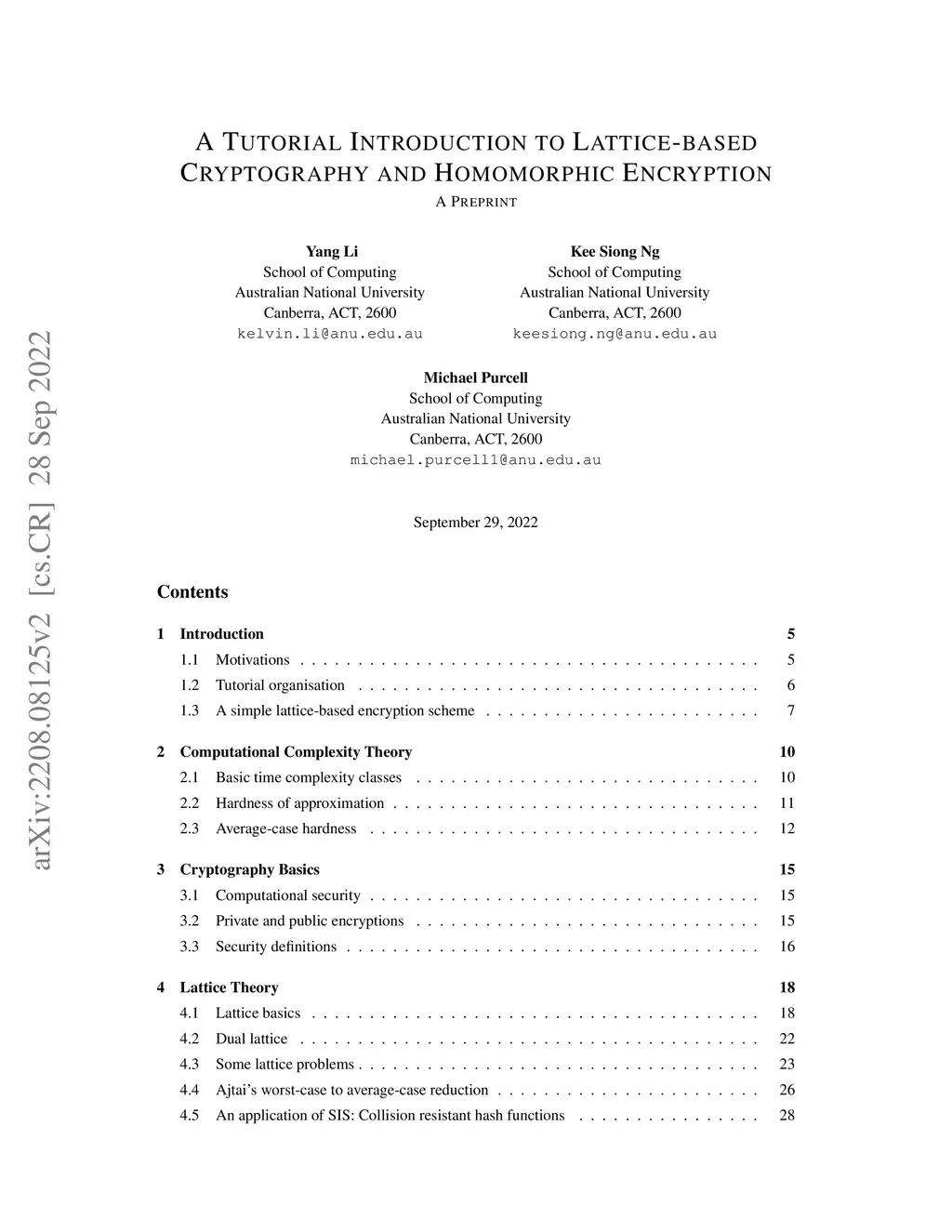 Why study Lattice-based Cryptography? There are a few ways to answer this question. 1. It is useful to have cryptosystems that are based on a variety of hard computational problems so the different cryptosystems are not all vulnerable in the same way. 2. The computational aspects of lattice-based cryptosystem are usually simple to understand and fairly easy to implement in practice. 3. Lattice-based cryptosystems have lower encryption/decryption computational complexities compared to popular cryptosystems that are based on the integer factorisation or the discrete logarithm problems. 4. Lattice-based cryptosystems enjoy strong worst-case hardness security proofs based on approximate versions of known NP-hard lattice problems. 5. Lattice-based cryptosystems are believed to be good candidates for post-quantum cryptography, since there are currently no known quantum algorithms for solving lattice problems that perform significantly better than the best-known classical (non-quantum) algorithms, unlike for integer factorisation and (elliptic curve) discrete logarithm problems. 6. Last but not least, interesting structures in lattice problems have led to significant advances in Homomorphic Encryption, a new research area with wide-ranging applications.