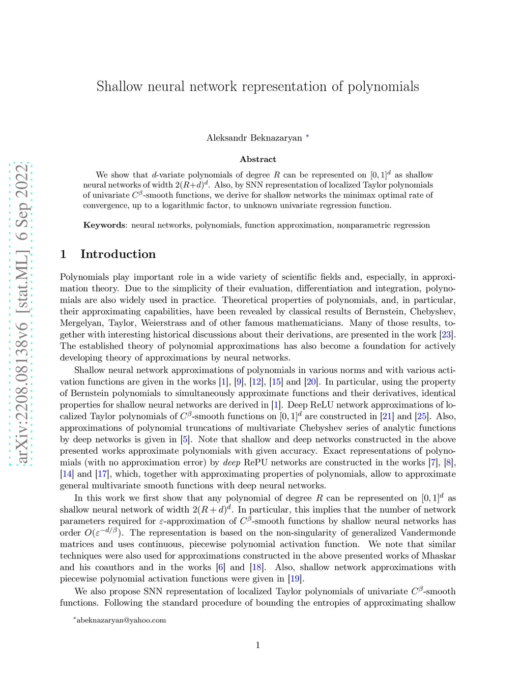 We show that -variate polynomials of degree can be represented on as shallow neural networks of width . Also, by SNN representation of localized Taylor polynomials of univariate -smooth functions, we derive for shallow networks the minimax optimal rate of convergence, up to a logarithmic factor, to unknown univariate regression function.