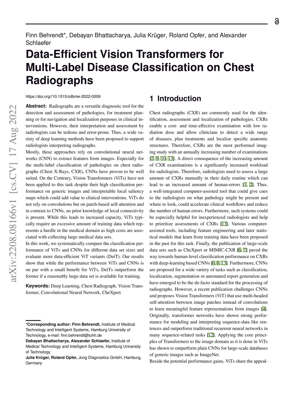 Radiographs are a versatile diagnostic tool for the detection and assessment of pathologies, for treatment planning or for navigation and localization purposes in clinical interventions. However, their interpretation and assessment by radiologists can be tedious and error-prone. Thus, a wide variety of deep learning methods have been proposed to support radiologists interpreting radiographs. Mostly, these approaches rely on convolutional neural networks (CNN) to extract features from images. Especially for the multi-label classification of pathologies on chest radiographs (Chest X-Rays, CXR), CNNs have proven to be well suited. On the Contrary, Vision Transformers (ViTs) have not been applied to this task despite their high classification performance on generic images and interpretable local saliency maps which could add value to clinical interventions. ViTs do not rely on convolutions but on patch-based self-attention and in contrast to CNNs, no prior knowledge of local connectivity is present. While this leads to increased capacity, ViTs typically require an excessive amount of training data which represents a hurdle in the medical domain as high costs are associated with collecting large medical data sets. In this work, we systematically compare the classification performance of ViTs and CNNs for different data set sizes and evaluate more data-efficient ViT variants (DeiT). Our results show that while the performance between ViTs and CNNs is on par with a small benefit for ViTs, DeiTs outperform the former if a reasonably large data set is available for training.