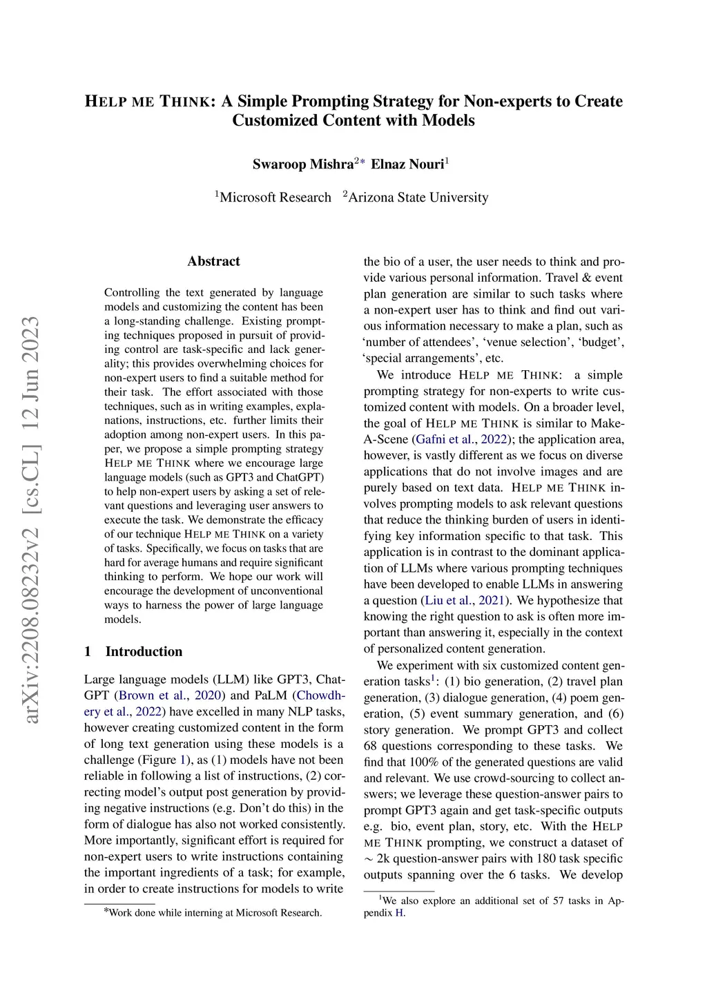 Controlling the text generated by language models and customizing the content has been a long-standing challenge. Existing prompting techniques proposed in pursuit of providing control are task-specific and lack generality; this provides overwhelming choices for non-expert users to find a suitable method for their task. The effort associated with those techniques, such as in writing examples, explanations, instructions, etc. further limits their adoption among non-expert users. In this paper, we propose a simple prompting strategy HELP ME THINK where we encourage GPT3 to help non-expert users by asking a set of relevant questions and leveraging user answers to execute the task. We demonstrate the efficacy of our technique HELP ME THINK on a variety of tasks. Specifically, we focus on tasks that are hard for average humans and require significant thinking to perform. We hope our work will encourage the development of unconventional ways to harness the power of large language models.