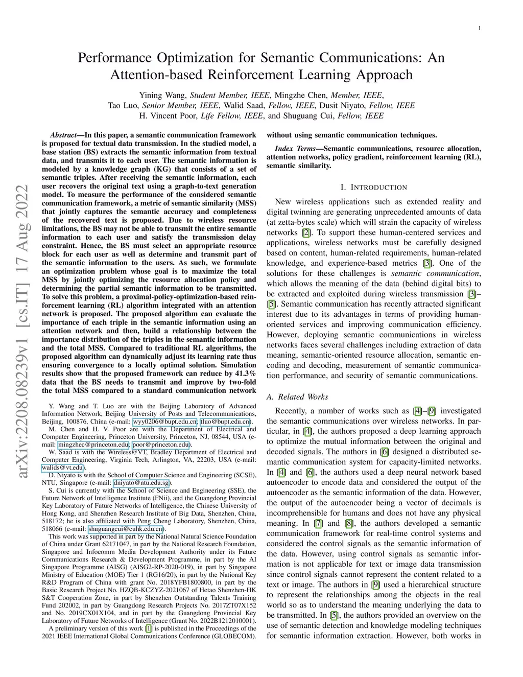 In this paper, a semantic communication framework is proposed for textual data transmission. In the studied model, a base station (BS) extracts the semantic information from textual data, and transmits it to each user. The semantic information is modeled by a knowledge graph (KG) that consists of a set of semantic triples. After receiving the semantic information, each user recovers the original text using a graph-to-text generation model. To measure the performance of the considered semantic communication framework, a metric of semantic similarity (MSS) that jointly captures the semantic accuracy and completeness of the recovered text is proposed. Due to wireless resource limitations, the BS may not be able to transmit the entire semantic information to each user and satisfy the transmission delay constraint. Hence, the BS must select an appropriate resource block for each user as well as determine and transmit part of the semantic information to the users. As such, we formulate an optimization problem whose goal is to maximize the total MSS by jointly optimizing the resource allocation policy and determining the partial semantic information to be transmitted. To solve this problem, a proximal-policy-optimization-based reinforcement learning (RL) algorithm integrated with an attention network is proposed. The proposed algorithm can evaluate the importance of each triple in the semantic information using an attention network and then, build a relationship between the importance distribution of the triples in the semantic information and the total MSS. Compared to traditional RL algorithms, the proposed algorithm can dynamically adjust its learning rate thus ensuring convergence to a locally optimal solution.
