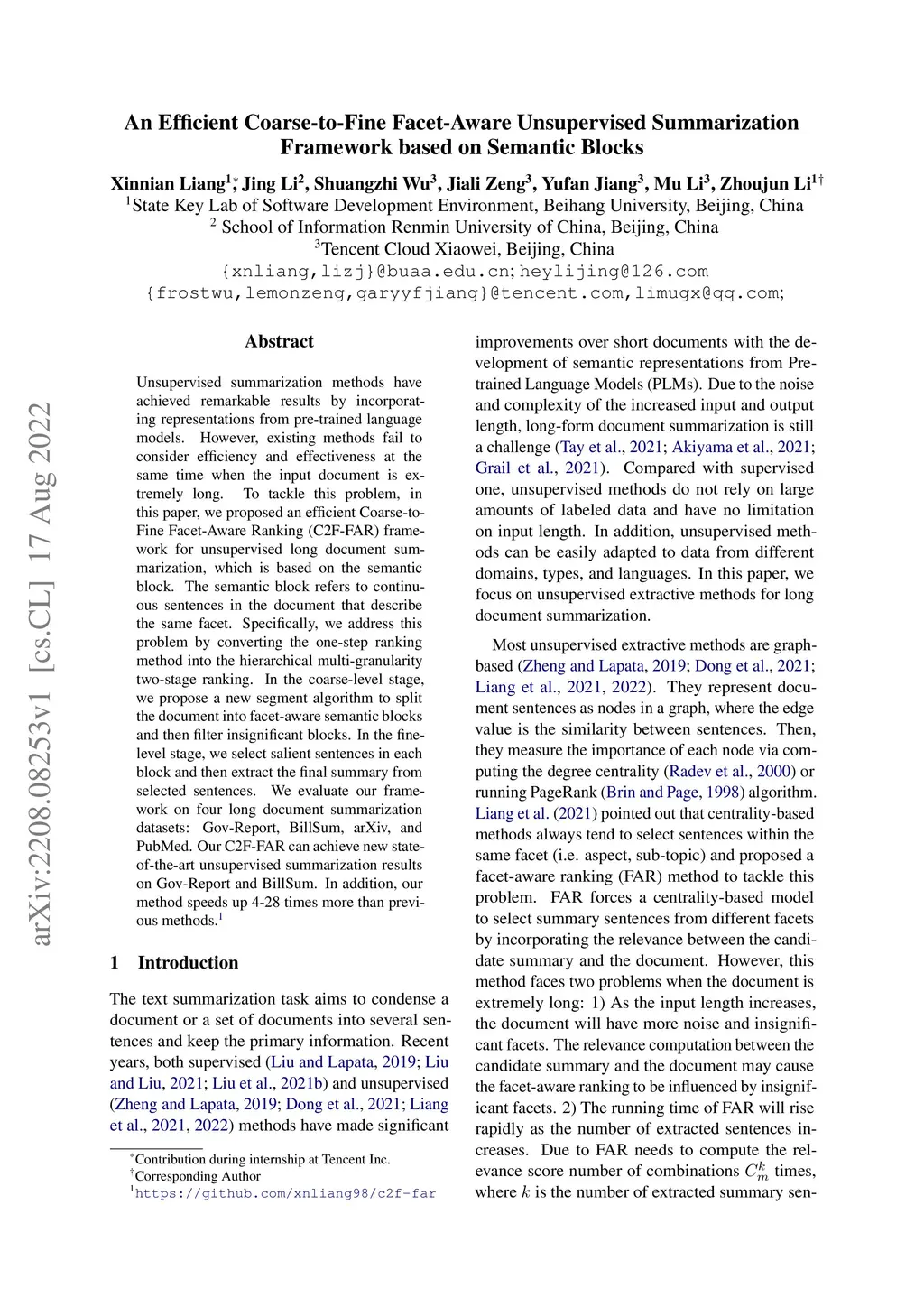 An Efficient Coarse-to-Fine Facet-Aware Unsupervised Summarization