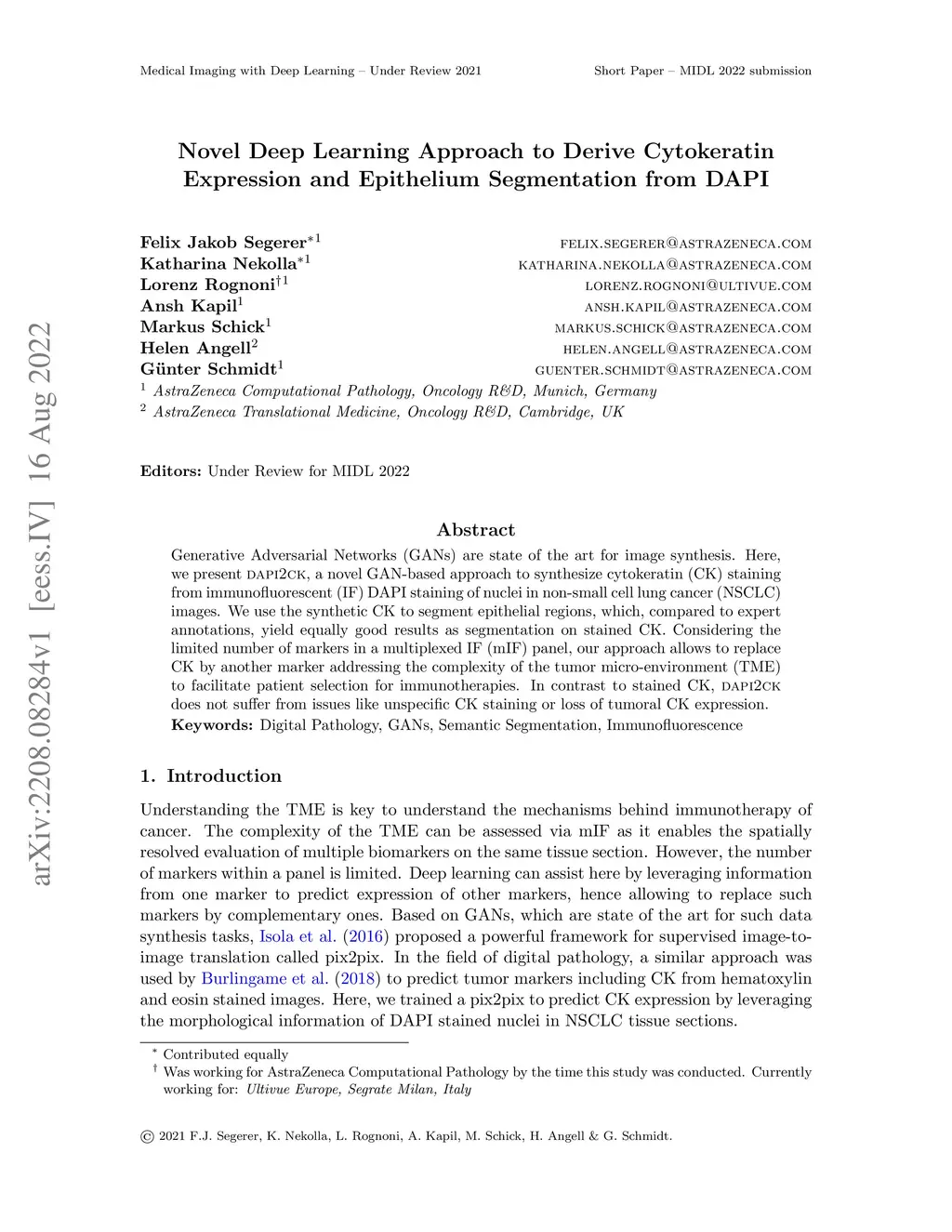 Generative Adversarial Networks (GANs) are state of the art for image synthesis. Here, we present dapi2ck, a novel GAN-based approach to synthesize cytokeratin (CK) staining from immunofluorescent (IF) DAPI staining of nuclei in non-small cell lung cancer (NSCLC) images. We use the synthetic CK to segment epithelial regions, which, compared to expert annotations, yield equally good results as segmentation on stained CK. Considering the limited number of markers in a multiplexed IF (mIF) panel, our approach allows to replace CK by another marker addressing the complexity of the tumor micro-environment (TME) to facilitate patient selection for immunotherapies. In contrast to stained CK, dapi2ck does not suffer from issues like unspecific CK staining or loss of tumoral CK expression.