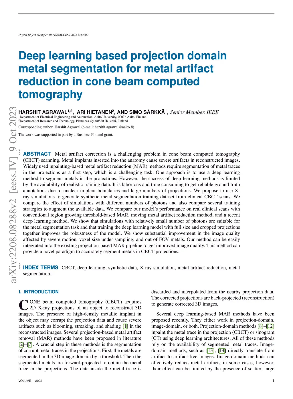Metal artifact correction is a challenging problem in cone beam computed tomography (CBCT) scanning. Metal implants inserted into the anatomy cause severe artifacts in reconstructed images. Widely used inpainting-based metal artifact reduction (MAR) methods require segmentation of metal traces in the projections as a first step, which is a challenging task. One approach is to use a deep learning method to segment metals in the projections. However, the success of deep learning methods is limited by the availability of realistic training data. It is laborious and time consuming to get reliable ground truth annotations due to unclear implant boundaries and large numbers of projections. We propose to use X-ray simulations to generate synthetic metal segmentation training dataset from clinical CBCT scans. We compare the effect of simulations with different numbers of photons and also compare several training strategies to augment the available data. We compare our model's performance on real clinical scans with conventional region growing threshold-based MAR, moving metal artifact reduction method, and a recent deep learning method. We show that simulations with relatively small number of photons are suitable for the metal segmentation task and that training the deep learning model with full size and cropped projections together improves the robustness of the model. We show substantial improvement in the image quality affected by severe motion, voxel size under-sampling, and out-of-FOV metals. Our method can be easily integrated into the existing projection-based MAR pipeline to get improved image quality. This method can provide a novel paradigm to accurately segment metals in CBCT projections.