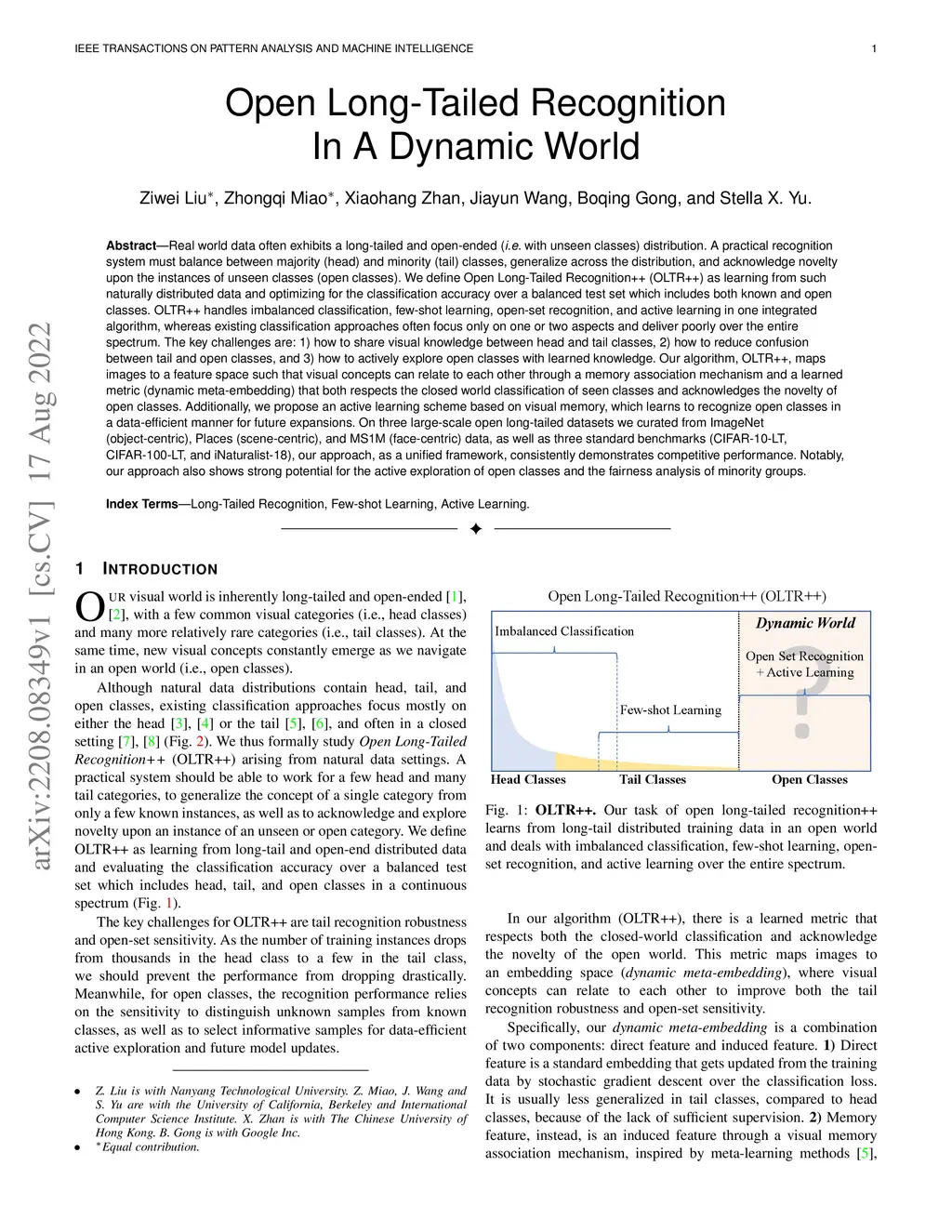 Real world data often exhibits a long-tailed and open-ended (with unseen classes) distribution. A practical recognition system must balance between majority (head) and minority (tail) classes, generalize across the distribution, and acknowledge novelty upon the instances of unseen classes (open classes). We define Open Long-Tailed Recognition++ (OLTR++) as learning from such naturally distributed data and optimizing for the classification accuracy over a balanced test set which includes both known and open classes. OLTR++ handles imbalanced classification, few-shot learning, open-set recognition, and active learning in one integrated algorithm, whereas existing classification approaches often focus only on one or two aspects and deliver poorly over the entire spectrum. The key challenges are: 1) how to share visual knowledge between head and tail classes, 2) how to reduce confusion between tail and open classes, and 3) how to actively explore open classes with learned knowledge. Our algorithm, OLTR++, maps images to a feature space such that visual concepts can relate to each other through a memory association mechanism and a learned metric (dynamic meta-embedding) that both respects the closed world classification of seen classes and acknowledges the novelty of open classes. Additionally, we propose an active learning scheme based on visual memory, which learns to recognize open classes in a data-efficient manner for future expansions. On three large-scale open long-tailed datasets we curated from ImageNet (object-centric), Places (scene-centric), and MS1M (face-centric) data, as well as three standard benchmarks (CIFAR-10-LT, CIFAR-100-LT, and iNaturalist-18), our approach, as a unified framework, consistently demonstrates competitive performance. Notably, our approach also shows strong potential for the active exploration of open classes and the fairness analysis of minority groups.