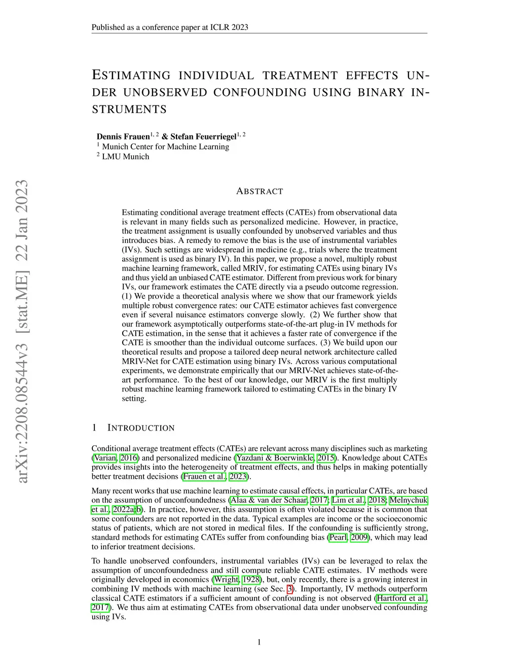 Estimating conditional average treatment effects (CATEs) from observational data is relevant in many fields such as personalized medicine. However, in practice, the treatment assignment is usually confounded by unobserved variables and thus introduces bias. A remedy to remove the bias is the use of instrumental variables (IVs). Such settings are widespread in medicine (e.g., trials where the treatment assignment is used as binary IV). In this paper, we propose a novel, multiply robust machine learning framework, called MRIV, for estimating CATEs using binary IVs and thus yield an unbiased CATE estimator. Different from previous work for binary IVs, our framework estimates the CATE directly via a pseudo outcome regression. (1)~We provide a theoretical analysis where we show that our framework yields multiple robust convergence rates: our CATE estimator achieves fast convergence even if several nuisance estimators converge slowly. (2)~We further show that our framework asymptotically outperforms state-of-the-art plug-in IV methods for CATE estimation, in the sense that it achieves a faster rate of convergence if the CATE is smoother than the individual outcome surfaces. (3)~We build upon our theoretical results and propose a tailored deep neural network architecture called MRIV-Net for CATE estimation using binary IVs. Across various computational experiments, we demonstrate empirically that our MRIV-Net achieves state-of-the-art performance. To the best of our knowledge, our MRIV is the first multiply robust machine learning framework tailored to estimating CATEs in the binary IV setting.