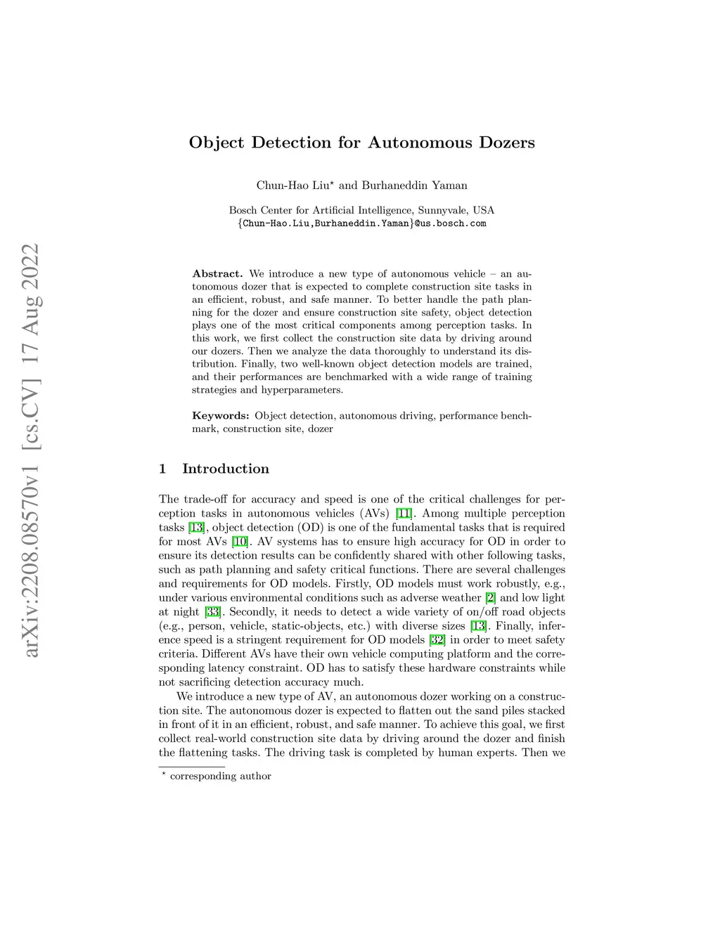 We introduce a new type of autonomous vehicle - an autonomous dozer that is expected to complete construction site tasks in an efficient, robust, and safe manner. To better handle the path planning for the dozer and ensure construction site safety, object detection plays one of the most critical components among perception tasks. In this work, we first collect the construction site data by driving around our dozers. Then we analyze the data thoroughly to understand its distribution. Finally, two well-known object detection models are trained, and their performances are benchmarked with a wide range of training strategies and hyperparameters.