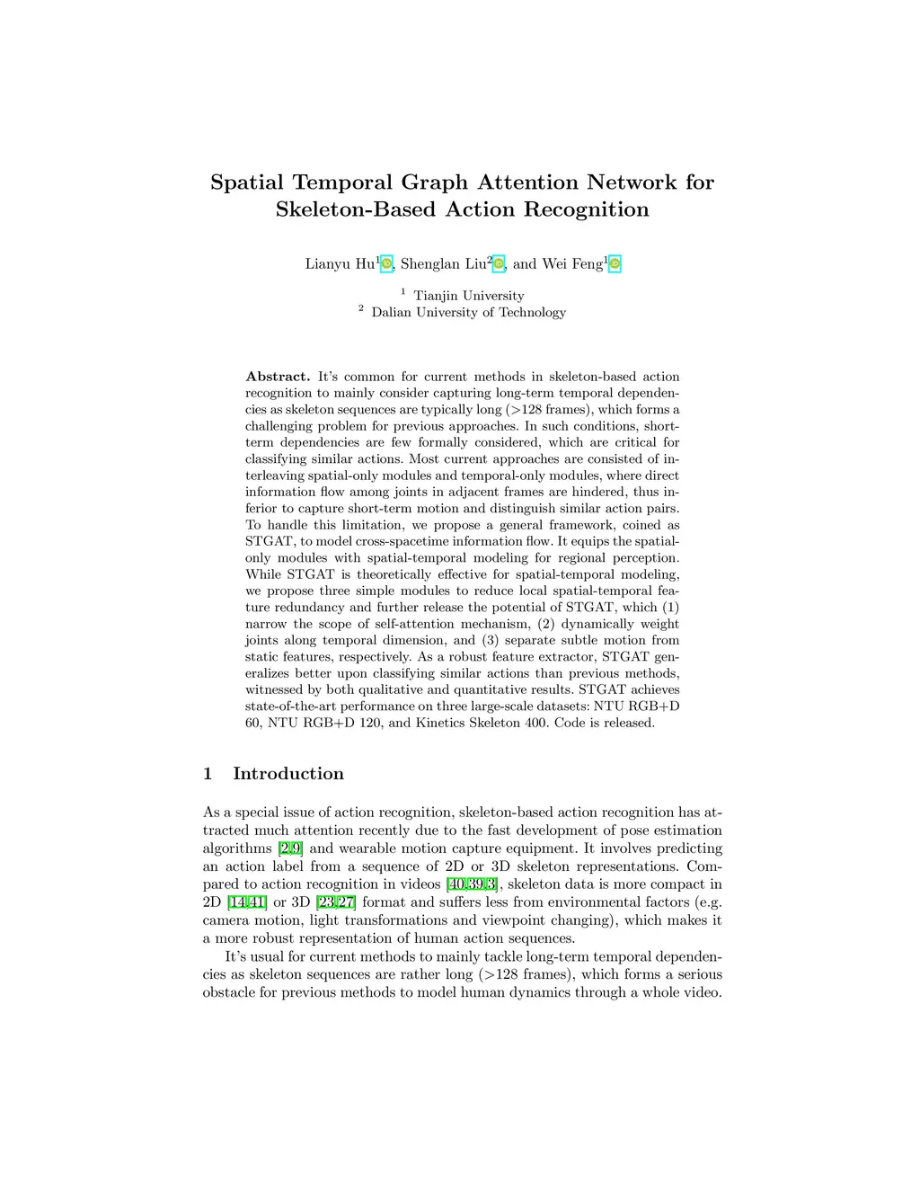 It's common for current methods in skeleton-based action recognition to mainly consider capturing long-term temporal dependencies as skeleton sequences are typically long (>128 frames), which forms a challenging problem for previous approaches. In such conditions, short-term dependencies are few formally considered, which are critical for classifying similar actions. Most current approaches are consisted of interleaving spatial-only modules and temporal-only modules, where direct information flow among joints in adjacent frames are hindered, thus inferior to capture short-term motion and distinguish similar action pairs. To handle this limitation, we propose a general framework, coined as STGAT, to model cross-spacetime information flow. It equips the spatial-only modules with spatial-temporal modeling for regional perception. While STGAT is theoretically effective for spatial-temporal modeling, we propose three simple modules to reduce local spatial-temporal feature redundancy and further release the potential of STGAT, which (1) narrow the scope of self-attention mechanism, (2) dynamically weight joints along temporal dimension, and (3) separate subtle motion from static features, respectively. As a robust feature extractor, STGAT generalizes better upon classifying similar actions than previous methods, witnessed by both qualitative and quantitative results. STGAT achieves state-of-the-art performance on three large-scale datasets: NTU RGB+D 60, NTU RGB+D 120, and Kinetics Skeleton 400. Code is released.