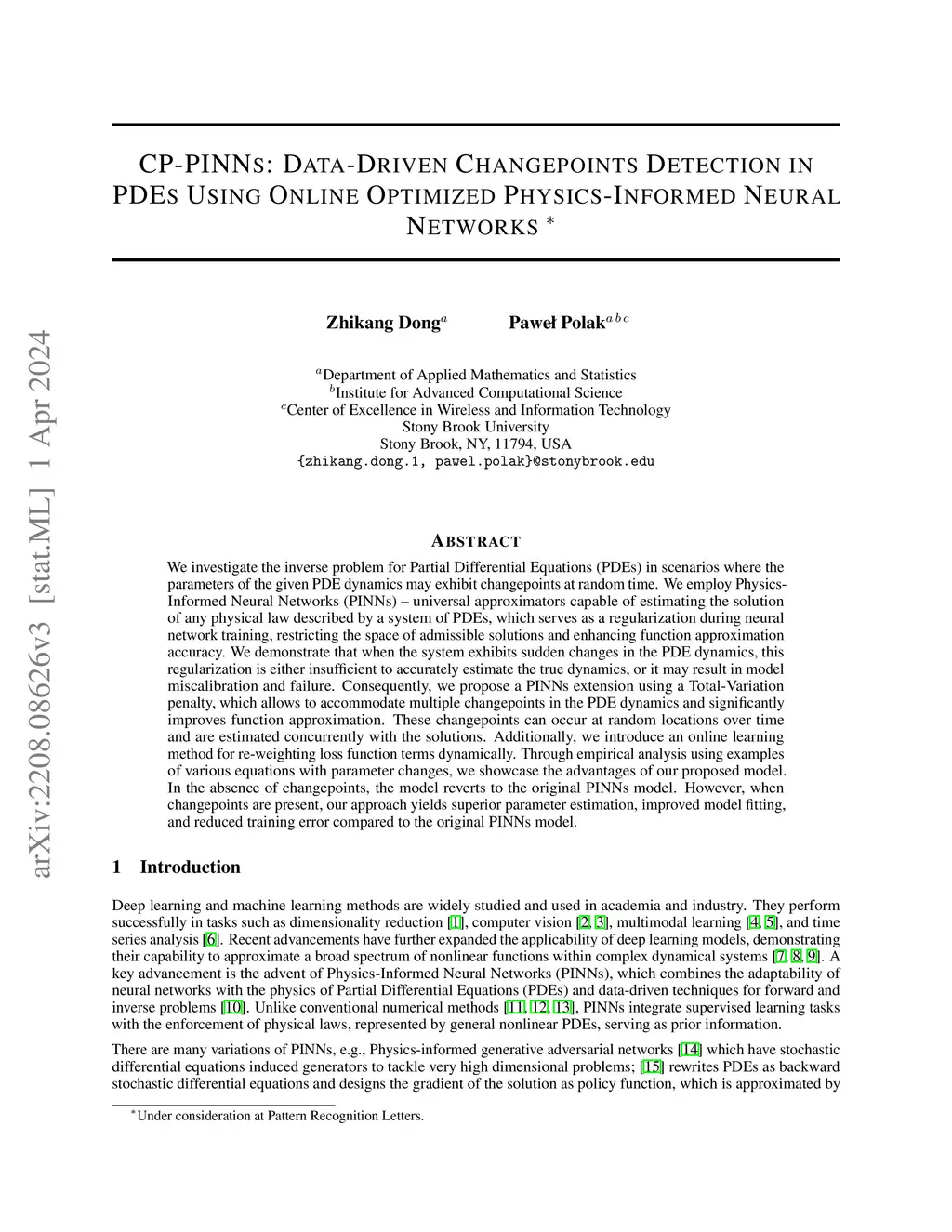 We investigate the inverse problem for Partial Differential Equations (PDEs) in scenarios where the parameters of the given PDE dynamics may exhibit changepoints at random time. We employ Physics-Informed Neural Networks (PINNs) - universal approximators capable of estimating the solution of any physical law described by a system of PDEs, which serves as a regularization during neural network training, restricting the space of admissible solutions and enhancing function approximation accuracy. We demonstrate that when the system exhibits sudden changes in the PDE dynamics, this regularization is either insufficient to accurately estimate the true dynamics, or it may result in model miscalibration and failure. Consequently, we propose a PINNs extension using a Total-Variation penalty, which allows to accommodate multiple changepoints in the PDE dynamics and significantly improves function approximation. These changepoints can occur at random locations over time and are estimated concurrently with the solutions. Additionally, we introduce an online learning method for re-weighting loss function terms dynamically. Through empirical analysis using examples of various equations with parameter changes, we showcase the advantages of our proposed model. In the absence of changepoints, the model reverts to the original PINNs model. However, when changepoints are present, our approach yields superior parameter estimation, improved model fitting, and reduced training error compared to the original PINNs model.