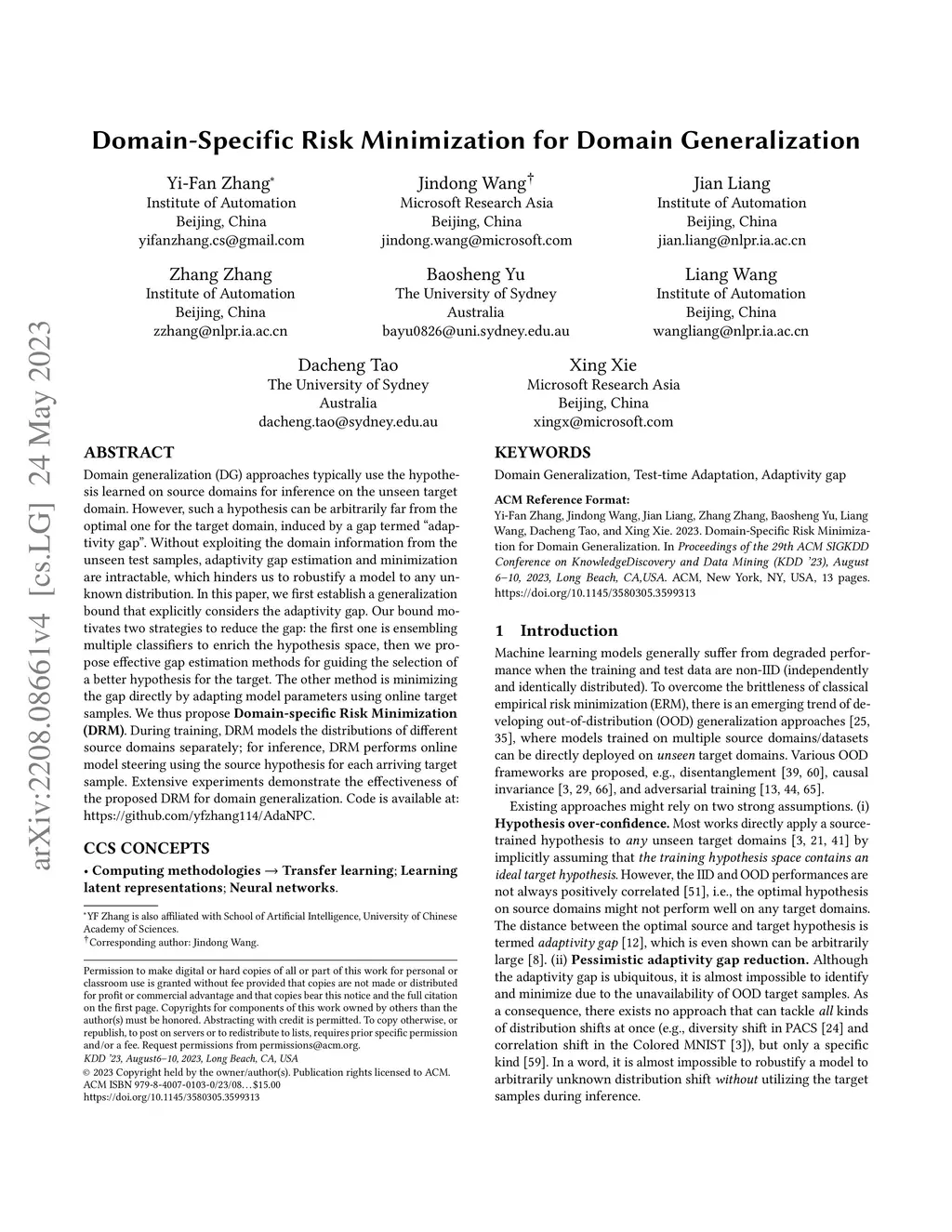 Recent domain generalization (DG) approaches typically use the hypothesis learned on source domains for inference on the unseen target domain. However, such a hypothesis can be arbitrarily far from the optimal one for the target domain, induced by a gap termed ``adaptivity gap''. Without exploiting the domain information from the unseen test samples, adaptivity gap estimation and minimization are intractable, which hinders us to robustify a model to any unknown distribution. In this paper, we first establish a generalization bound that explicitly considers the adaptivity gap. Our bound motivates two strategies to reduce the gap: the first one is ensembling multiple classifiers to enrich the hypothesis space, then we propose effective gap estimation methods for guiding the selection of a better hypothesis for the target. The other method is minimizing the gap directly by adapting model parameters using online target samples. We thus propose \textbf{Domain-specific Risk Minimization (DRM)}. During training, DRM models the distributions of different source domains separately; for inference, DRM performs online model steering using the source hypothesis for each arriving target sample. Extensive experiments demonstrate the effectiveness of the proposed DRM for domain generalization with the following advantages: 1) it significantly outperforms competitive baselines on different distributional shift settings; 2) it achieves either comparable or superior accuracies on all source domains compared to vanilla empirical risk minimization; 3) it remains simple and efficient during training, and 4) it is complementary to invariant learning approaches.