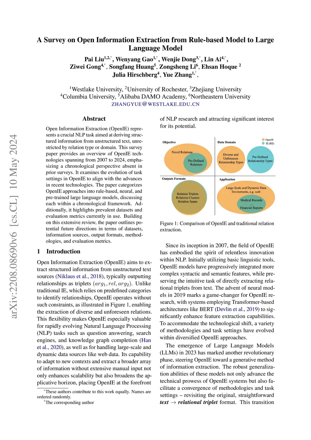Open Information Extraction (OpenIE) represents a crucial NLP task aimed at deriving structured information from unstructured text, unrestricted by relation type or domain. This survey paper provides an overview of OpenIE technologies spanning from 2007 to 2024, emphasizing a chronological perspective absent in prior surveys. It examines the evolution of task settings in OpenIE to align with the advances in recent technologies. The paper categorizes OpenIE approaches into rule-based, neural, and pre-trained large language models, discussing each within a chronological framework. Additionally, it highlights prevalent datasets and evaluation metrics currently in use. Building on this extensive review, the paper outlines potential future directions in terms of datasets, information sources, output formats, methodologies, and evaluation metrics.