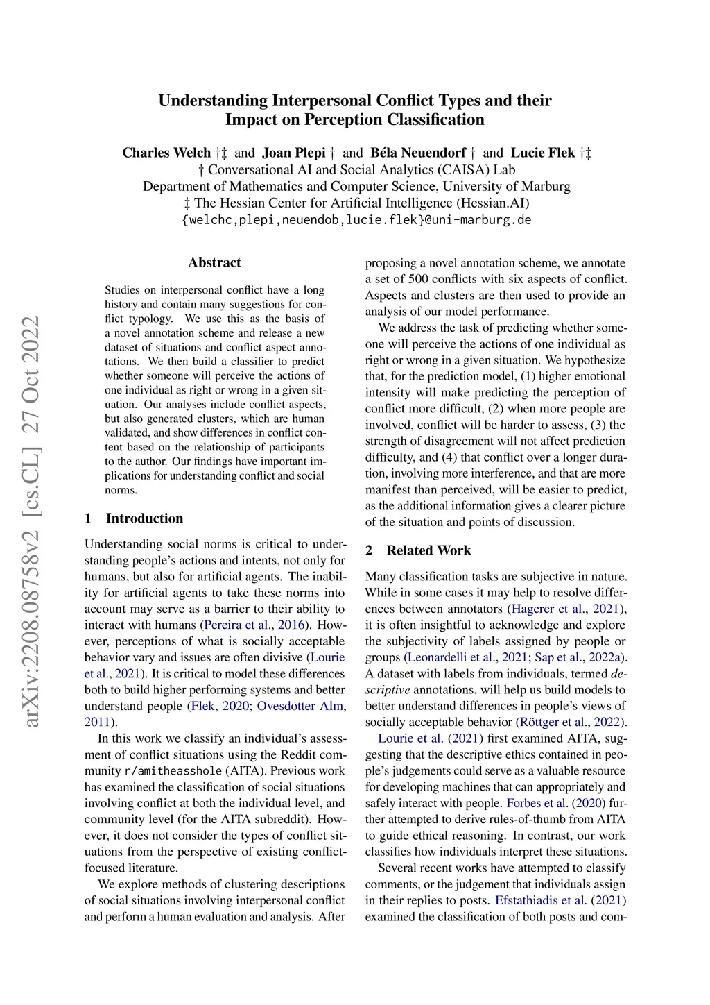 Studies on interpersonal conflict have a long history and contain many suggestions for conflict typology. We use this as the basis of a novel annotation scheme and release a new dataset of situations and conflict aspect annotations. We then build a classifier to predict whether someone will perceive the actions of one individual as right or wrong in a given situation. Our analyses include conflict aspects, but also generated clusters, which are human validated, and show differences in conflict content based on the relationship of participants to the author. Our findings have important implications for understanding conflict and social norms.