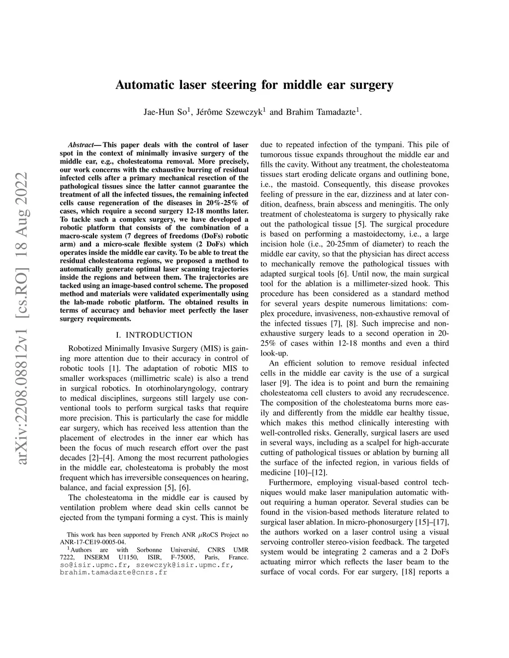 This paper deals with the control of laser spot in the context of minimally invasive surgery of the middle ear, e.g., cholesteatoma removal. More precisely, our work is concerned with the exhaustive burring of residual infected cells after primary mechanical resection of the pathological tissues since the latter cannot guarantee the treatment of all the infected tissues, the remaining infected cells cause regeneration of the diseases in 20%-25\-% of cases, which require a second surgery 12-18 months later. To tackle such a complex surgery, we have developed a robotic platform that consists of the combination of a macro-scale system (7 degrees of freedom (DoFs) robotic arm) and a micro-scale flexible system (2 DoFs) which operates inside the middle ear cavity. To be able to treat the residual cholesteatoma regions, we proposed a method to automatically generate optimal laser scanning trajectories inside the regions and between them. The trajectories are tacked using an image-based control scheme. The proposed method and materials were validated experimentally using the lab-made robotic platform. The obtained results in terms of accuracy and behaviour meet perfectly the laser surgery requirements.