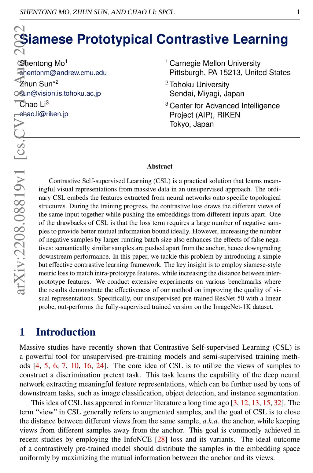 Contrastive Self-supervised Learning (CSL) is a practical solution that learns meaningful visual representations from massive data in an unsupervised approach. The ordinary CSL embeds the features extracted from neural networks onto specific topological structures. During the training progress, the contrastive loss draws the different views of the same input together while pushing the embeddings from different inputs apart. One of the drawbacks of CSL is that the loss term requires a large number of negative samples to provide better mutual information bound ideally. However, increasing the number of negative samples by larger running batch size also enhances the effects of false negatives: semantically similar samples are pushed apart from the anchor, hence downgrading downstream performance. In this paper, we tackle this problem by introducing a simple but effective contrastive learning framework. The key insight is to employ siamese-style metric loss to match intra-prototype features, while increasing the distance between inter-prototype features. We conduct extensive experiments on various benchmarks where the results demonstrate the effectiveness of our method on improving the quality of visual representations. Specifically, our unsupervised pre-trained ResNet-50 with a linear probe, out-performs the fully-supervised trained version on the ImageNet-1K dataset.