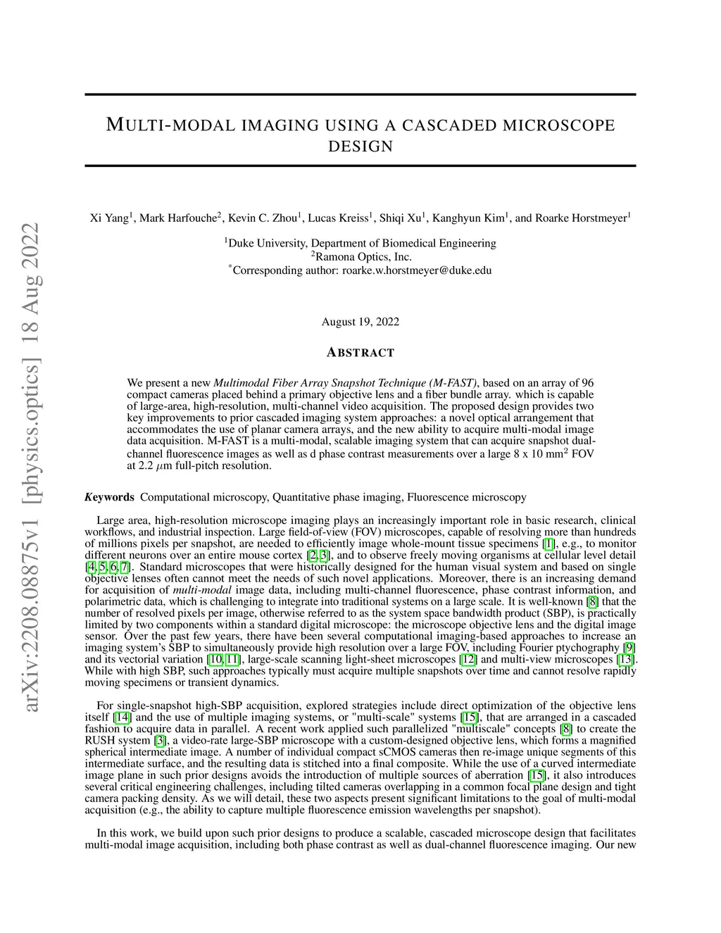 We present a new Multimodal Fiber Array Snapshot Technique (M-FAST), based on an array of 96 compact cameras placed behind a primary objective lens and a fiber bundle array. which is capable of large-area, high-resolution, multi-channel video acquisition. The proposed design provides two key improvements to prior cascaded imaging system approaches: a novel optical arrangement that accommodates the use of planar camera arrays, and the new ability to acquire multi-modal image data acquisition. M-FAST is a multi-modal, scalable imaging system that can acquire snapshot dual-channel fluorescence images as well as d phase contrast measurements over a large 8x10mm^2 FOV at 2.2um full-pitch resolution.