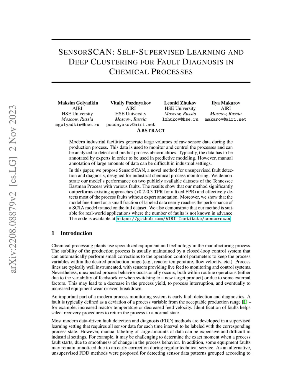 Modern industrial facilities generate large volumes of raw sensor data during the production process. This data is used to monitor and control the processes and can be analyzed to detect and predict process abnormalities. Typically, the data has to be annotated by experts in order to be used in predictive modeling. However, manual annotation of large amounts of data can be difficult in industrial settings. In this paper, we propose SensorSCAN, a novel method for unsupervised fault detection and diagnosis, designed for industrial chemical process monitoring. We demonstrate our model's performance on two publicly available datasets of the Tennessee Eastman Process with various faults. The results show that our method significantly outperforms existing approaches (+0.2-0.3 TPR for a fixed FPR) and effectively detects most of the process faults without expert annotation. Moreover, we show that the model fine-tuned on a small fraction of labeled data nearly reaches the performance of a SOTA model trained on the full dataset. We also demonstrate that our method is suitable for real-world applications where the number of faults is not known in advance. The code is available at https://github.com/AIRI-Institute/sensorscan.