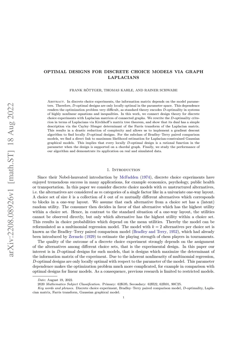 In discrete choice experiments, the information matrix depends on the model parameters. Therefore, $ D $-optimal designs are only locally optimal in the parameter space. This dependence renders the optimization problem very difficult, as standard theory encodes $ D $-optimality in systems of highly nonlinear equations and inequalities. In this work, we connect design theory for discrete choice experiments with Laplacian matrices of connected graphs. We rewrite the $ D $-optimality criterion in terms of Laplacians via Kirchhoff's matrix tree theorem, and show that its dual has a simple description via the Cayley--Menger determinant of the Farris transform of the Laplacian matrix. This results in a drastic reduction of complexity and allows us to implement a gradient descent algorithm to find locally $ D $-optimal designs. For the subclass of Bradley--Terry paired comparison models, we find a direct link to maximum likelihood estimation for Laplacian-constrained Gaussian graphical models. This implies that every locally $ D $-optimal design is a rational function in the parameter when the design is supported on a chordal graph. Finally, we study the performance of our algorithm and demonstrate its application on real and simulated data.