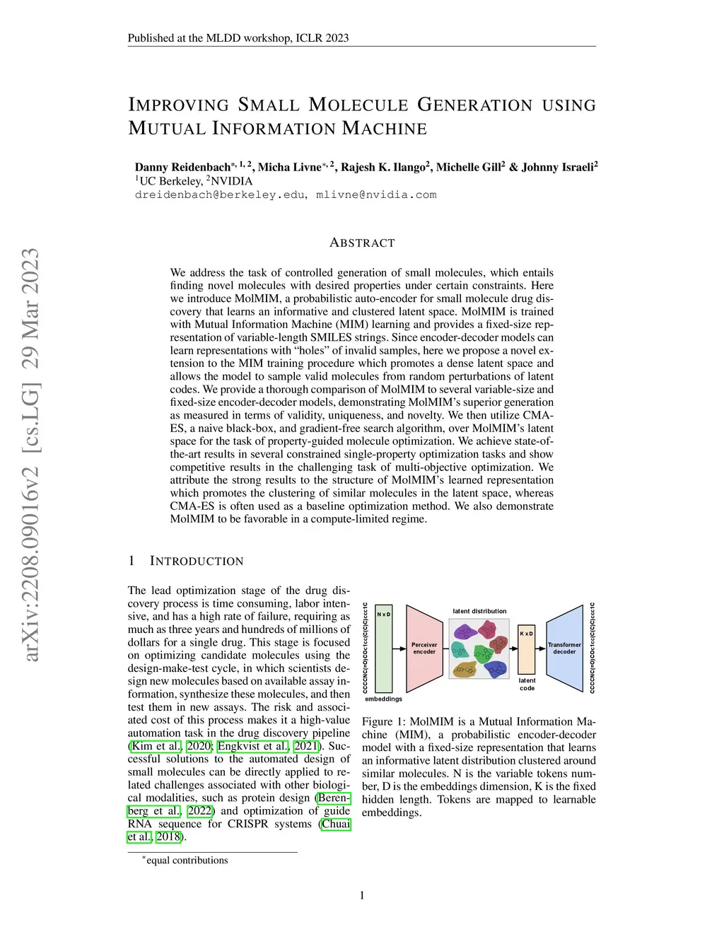 We address the task of controlled generation of small molecules, which entails finding novel molecules with desired properties under certain constraints (e.g., similarity to a reference molecule). Here we introduce MolMIM, a probabilistic auto-encoder for small molecule drug discovery that learns an informative and clustered latent space. MolMIM is trained with Mutual Information Machine (MIM) learning, and provides a fixed length representation of variable length SMILES strings. Since encoder-decoder models can learn representations with ``holes'' of invalid samples, here we propose a novel extension to the training procedure which promotes a dense latent space, and allows the model to sample valid molecules from random perturbations of latent codes. We provide a thorough comparison of MolMIM to several variable-size and fixed-size encoder-decoder models, demonstrating MolMIM's superior generation as measured in terms of validity, uniqueness, and novelty. We then utilize CMA-ES, a naive black-box and gradient free search algorithm, over MolMIM's latent space for the task of property guided molecule optimization. We achieve state-of-the-art results in several constrained single property optimization tasks as well as in the challenging task of multi-objective optimization, improving over previous success rate SOTA by more than 5\% . We attribute the strong results to MolMIM's latent representation which clusters similar molecules in the latent space, whereas CMA-ES is often used as a baseline optimization method. We also demonstrate MolMIM to be favourable in a compute limited regime, making it an attractive model for such cases.