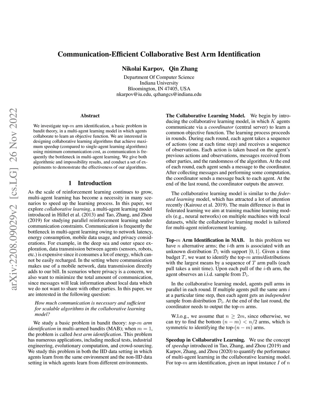 We investigate top- arm identification, a basic problem in bandit theory, in a multi-agent learning model in which agents collaborate to learn an objective function. We are interested in designing collaborative learning algorithms that achieve maximum speedup (compared to single-agent learning algorithms) using minimum communication cost, as communication is frequently the bottleneck in multi-agent learning. We give both algorithmic and impossibility results, and conduct a set of experiments to demonstrate the effectiveness of our algorithms.