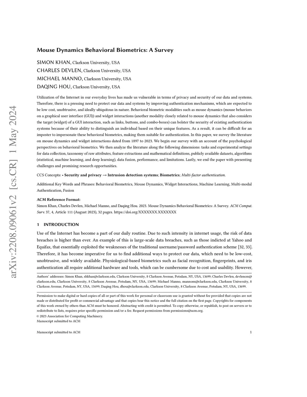 Mouse Dynamics Behavioral Biometrics: A Survey