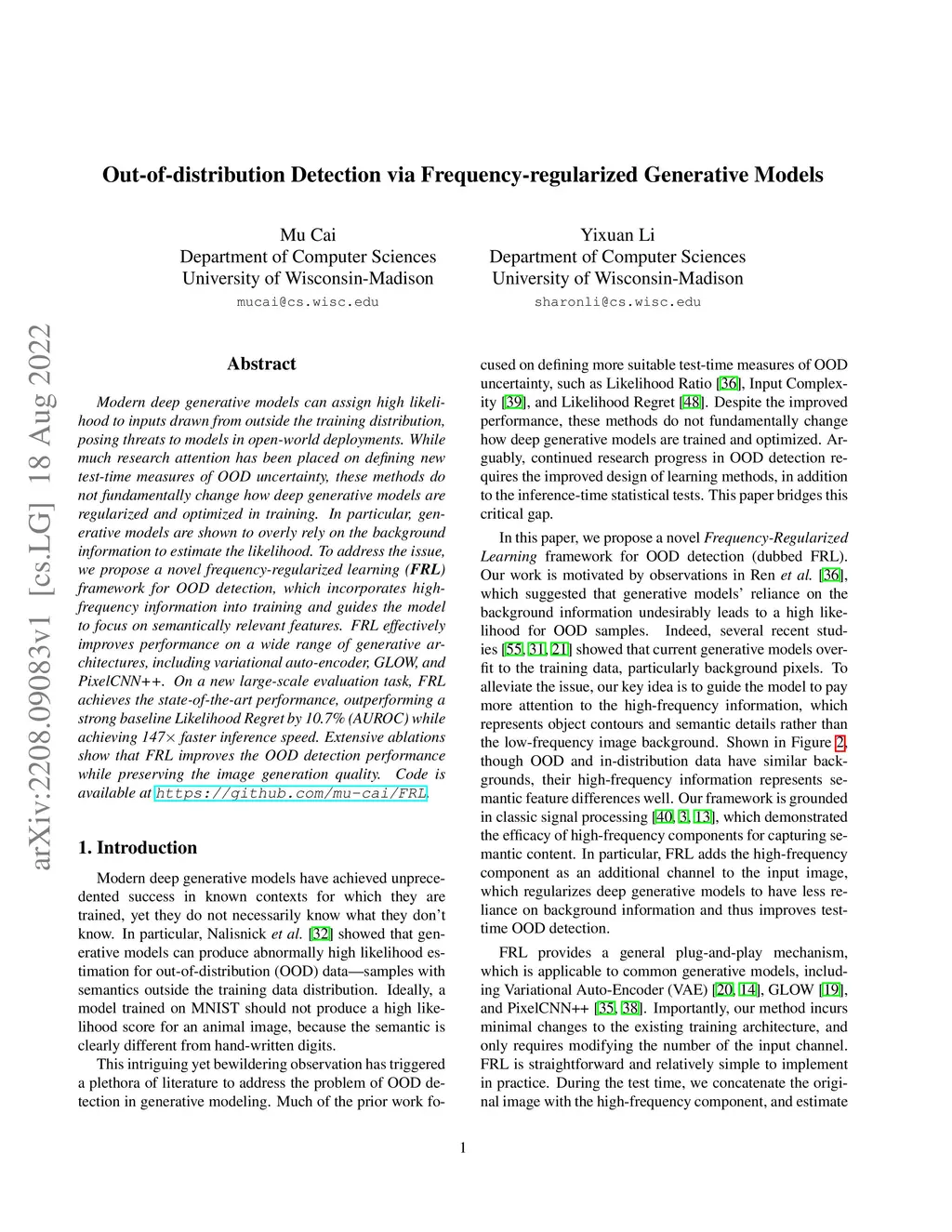 Out-of-distribution Detection via Frequency-regularized Generative