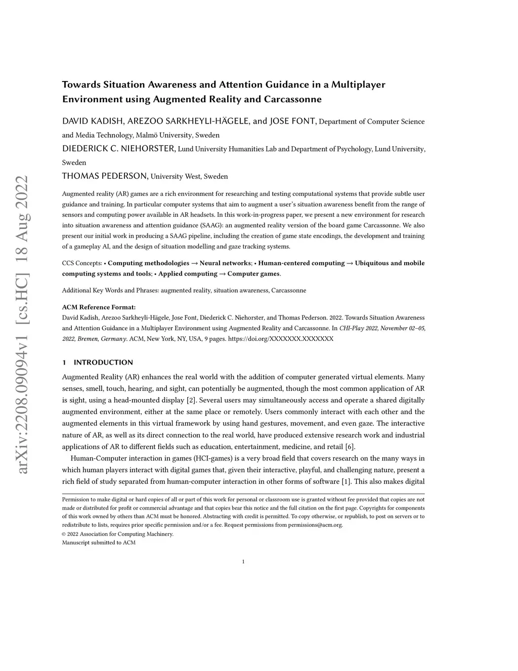 Augmented reality (AR) games are a rich environment for researching and testing computational systems that provide subtle user guidance and training. In particular computer systems that aim to augment a user's situation awareness benefit from the range of sensors and computing power available in AR headsets. In this work-in-progress paper, we present a new environment for research into situation awareness and attention guidance (SAAG): an augmented reality version of the board game Carcassonne. We also present our initial work in producing a SAAG pipeline, including the creation of game state encodings, the development and training of a gameplay AI, and the design of situation modelling and gaze tracking systems.