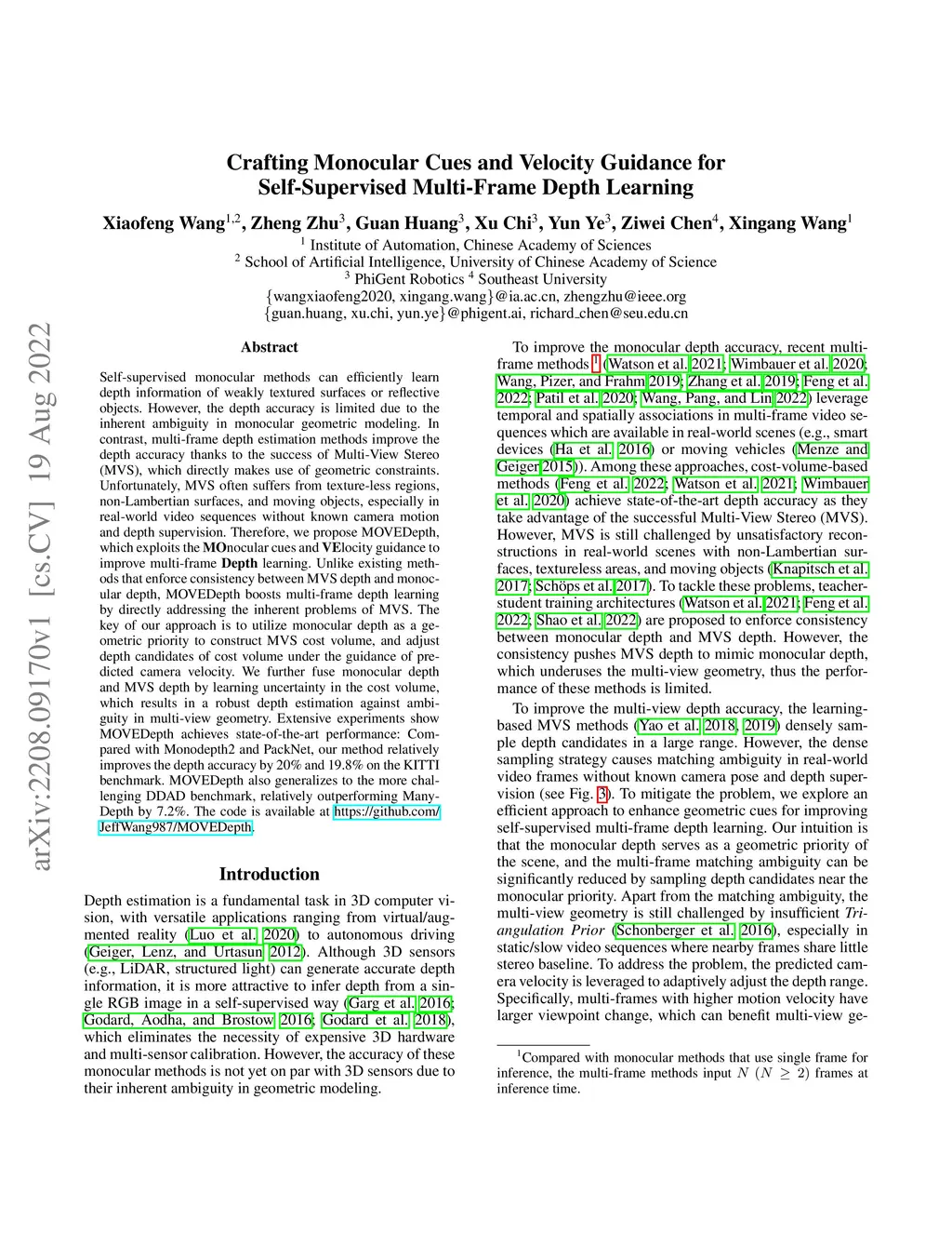 Self-supervised monocular methods can efficiently learn depth information of weakly textured surfaces or reflective objects. However, the depth accuracy is limited due to the inherent ambiguity in monocular geometric modeling. In contrast, multi-frame depth estimation methods improve the depth accuracy thanks to the success of Multi-View Stereo (MVS), which directly makes use of geometric constraints. Unfortunately, MVS often suffers from texture-less regions, non-Lambertian surfaces, and moving objects, especially in real-world video sequences without known camera motion and depth supervision. Therefore, we propose MOVEDepth, which exploits the MOnocular cues and VElocity guidance to improve multi-frame Depth learning. Unlike existing methods that enforce consistency between MVS depth and monocular depth, MOVEDepth boosts multi-frame depth learning by directly addressing the inherent problems of MVS. The key of our approach is to utilize monocular depth as a geometric priority to construct MVS cost volume, and adjust depth candidates of cost volume under the guidance of predicted camera velocity. We further fuse monocular depth and MVS depth by learning uncertainty in the cost volume, which results in a robust depth estimation against ambiguity in multi-view geometry. Extensive experiments show MOVEDepth achieves state-of-the-art performance: Compared with Monodepth2 and PackNet, our method relatively improves the depth accuracy by 20\% and 19.8\% on the KITTI benchmark. MOVEDepth also generalizes to the more challenging DDAD benchmark, relatively outperforming ManyDepth by 7.2\%. The code is available at https://github.com/JeffWang987/MOVEDepth.