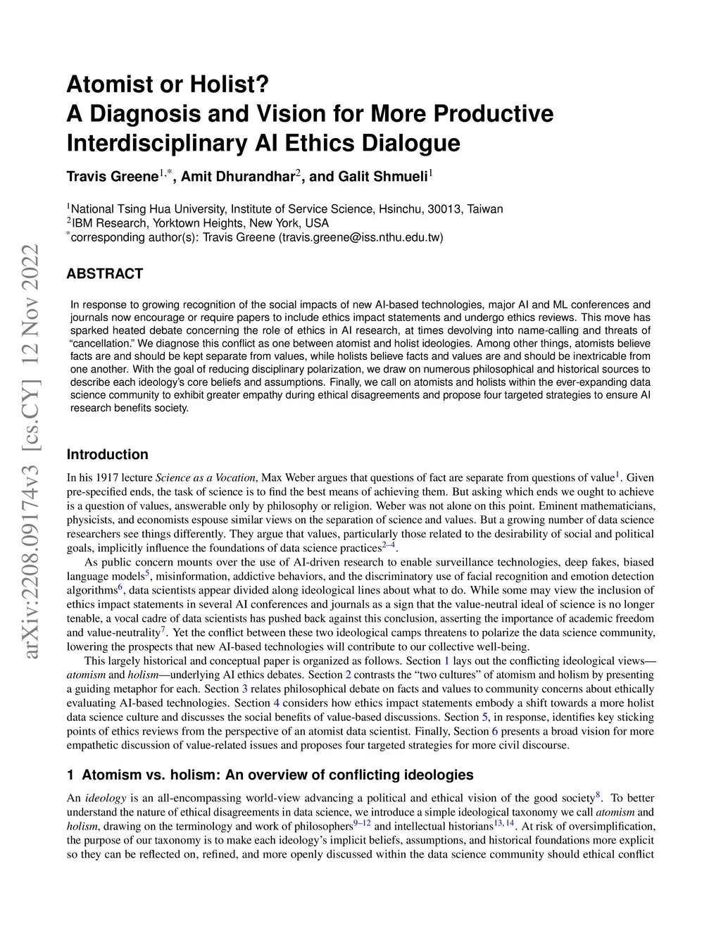 In response to growing recognition of the social impact of new AI-based technologies, major AI and ML conferences and journals now encourage or require papers to include ethics impact statements and undergo ethics reviews. This move has sparked heated debate concerning the role of ethics in AI research, at times devolving into name-calling and threats of "cancellation." We diagnose this conflict as one between atomist and holist ideologies. Among other things, atomists believe facts are and should be kept separate from values, while holists believe facts and values are and should be inextricable from one another. With the goal of reducing disciplinary polarization, we draw on numerous philosophical and historical sources to describe each ideology's core beliefs and assumptions. Finally, we call on atomists and holists within the ever-expanding data science community to exhibit greater empathy during ethical disagreements and propose four targeted strategies to ensure AI research benefits society.