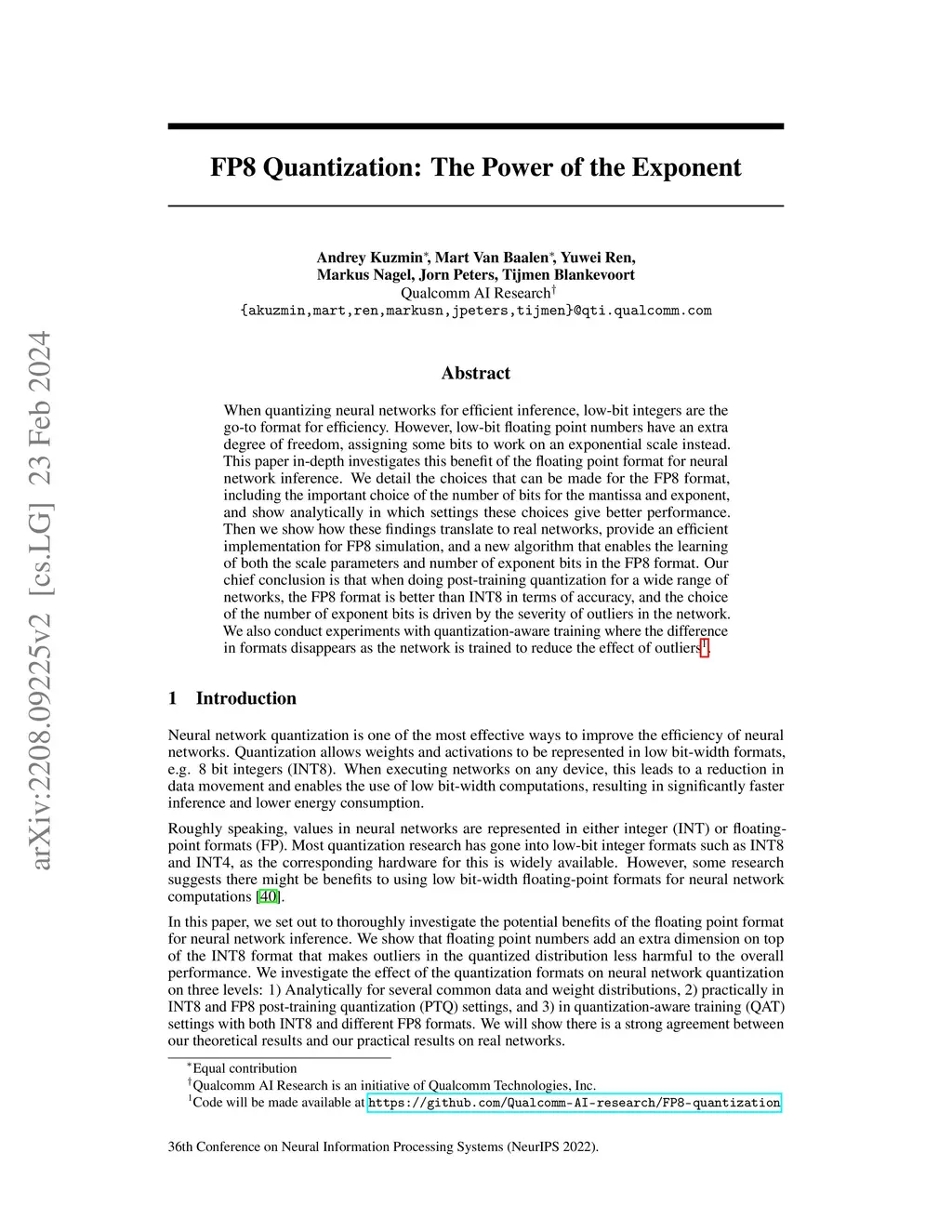 When quantizing neural networks for efficient inference, low-bit integers are the go-to format for efficiency. However, low-bit floating point numbers have an extra degree of freedom, assigning some bits to work on an exponential scale instead. This paper in-depth investigates this benefit of the floating point format for neural network inference. We detail the choices that can be made for the FP8 format, including the important choice of the number of bits for the mantissa and exponent, and show analytically in which settings these choices give better performance. Then we show how these findings translate to real networks, provide an efficient implementation for FP8 simulation, and a new algorithm that enables the learning of both the scale parameters and the number of exponent bits in the FP8 format. Our chief conclusion is that when doing post-training quantization for a wide range of networks, the FP8 format is better than INT8 in terms of accuracy, and the choice of the number of exponent bits is driven by the severity of outliers in the network. We also conduct experiments with quantization-aware training where the difference in formats disappears as the network is trained to reduce the effect of outliers.
