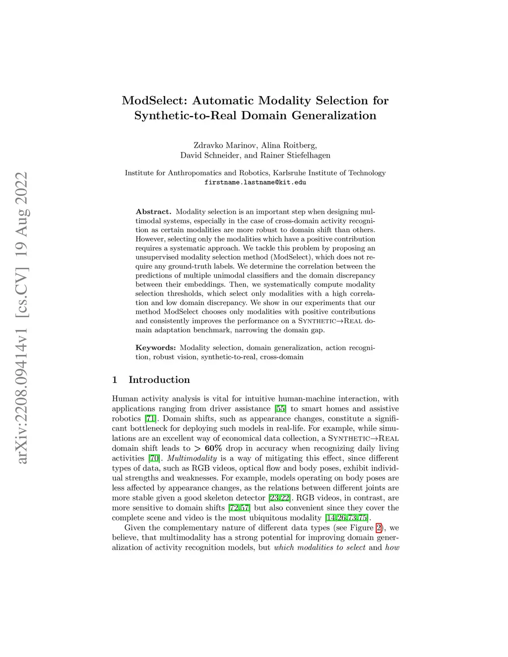 Modality selection is an important step when designing multimodal systems, especially in the case of cross-domain activity recognition as certain modalities are more robust to domain shift than others. However, selecting only the modalities which have a positive contribution requires a systematic approach. We tackle this problem by proposing an unsupervised modality selection method (ModSelect), which does not require any ground-truth labels. We determine the correlation between the predictions of multiple unimodal classifiers and the domain discrepancy between their embeddings. Then, we systematically compute modality selection thresholds, which select only modalities with a high correlation and low domain discrepancy. We show in our experiments that our method ModSelect chooses only modalities with positive contributions and consistently improves the performance on a Synthetic-to-Real domain adaptation benchmark, narrowing the domain gap.