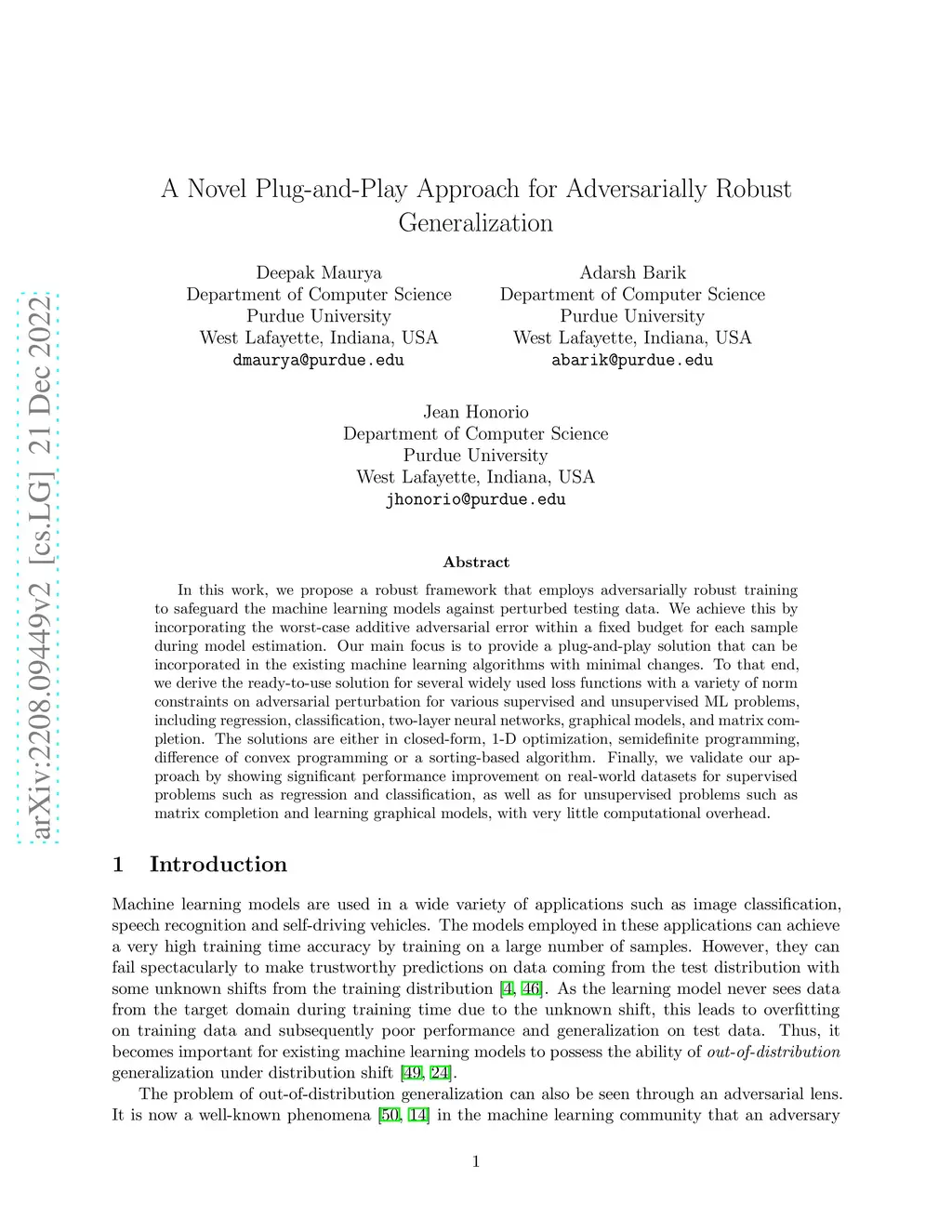 In this work, we propose a robust framework that employs adversarially robust training to safeguard the machine learning models against perturbed testing data. We achieve this by incorporating the worst-case additive adversarial error within a fixed budget for each sample during model estimation. Our main focus is to provide a plug-and-play solution that can be incorporated in the existing machine learning algorithms with minimal changes. To that end, we derive the ready-to-use solution for several widely used loss functions with a variety of norm constraints on adversarial perturbation for various supervised and unsupervised ML problems, including regression, classification, two-layer neural networks, graphical models, and matrix completion. The solutions are either in closed-form, 1-D optimization, semidefinite programming, difference of convex programming or a sorting-based algorithm. Finally, we validate our approach by showing significant performance improvement on real-world datasets for supervised problems such as regression and classification, as well as for unsupervised problems such as matrix completion and learning graphical models, with very little computational overhead.