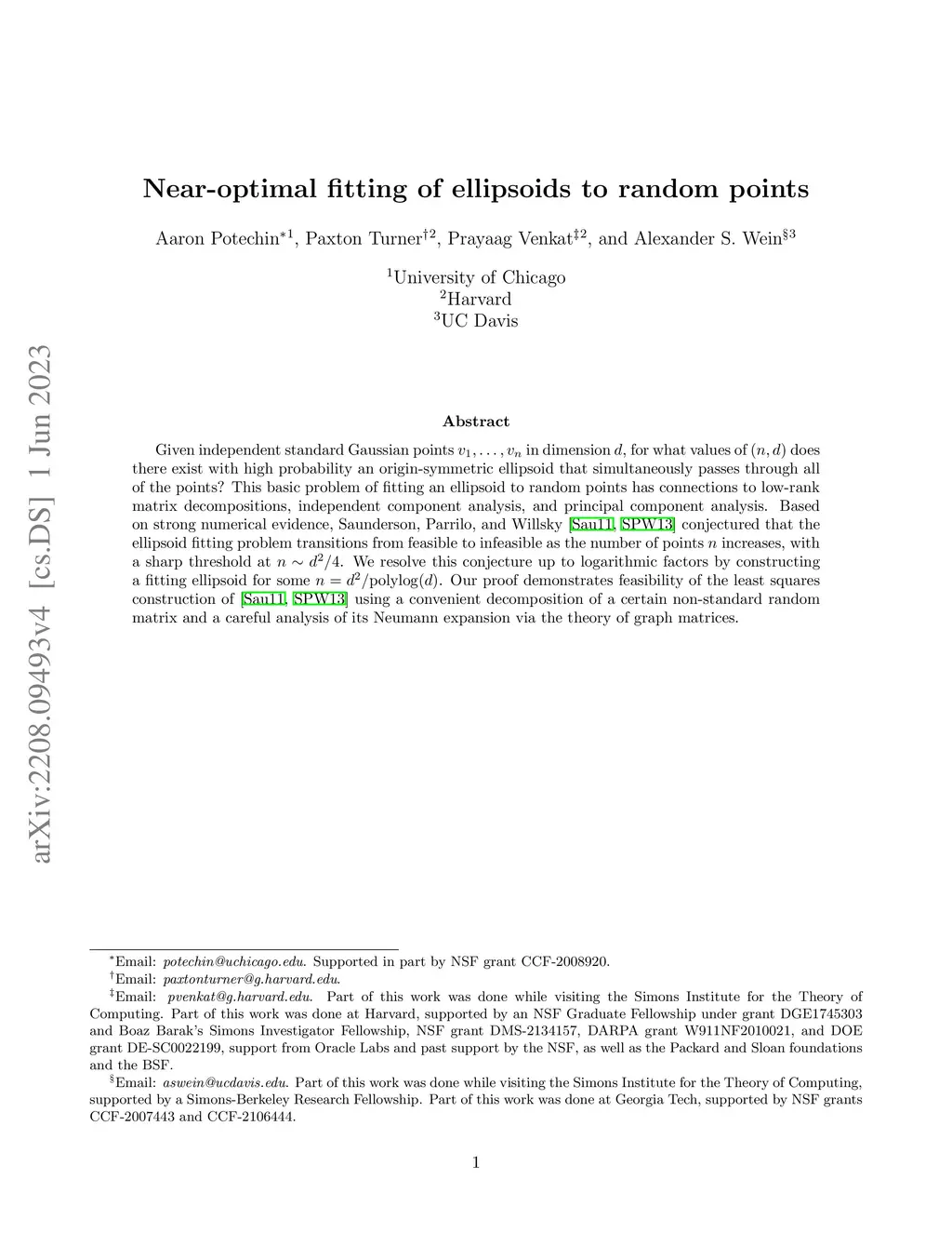 Given independent standard Gaussian points v1,,vnv_1, \ldots, v_n in dimension dd, for what values of (n,d)(n, d) does there exist with high probability an origin-symmetric ellipsoid that simultaneously passes through all of the points? This basic problem of fitting an ellipsoid to random points has connections to low-rank matrix decompositions, independent component analysis, and principal component analysis. Based on strong numerical evidence, Saunderson, Parrilo, and Willsky [Proc. of Conference on Decision and Control, pp. 6031-6036, 2013] conjecture that the ellipsoid fitting problem transitions from feasible to infeasible as the number of points nn increases, with a sharp threshold at nd2/4n \sim d^2/4. We resolve this conjecture up to logarithmic factors by constructing a fitting ellipsoid for some n=Ω(d2/polylog(d))n = \Omega( \, d^2/\mathrm{polylog}(d) \,), improving prior work of Ghosh et al. [Proc. of Symposium on Foundations of Computer Science, pp. 954-965, 2020] that requires n=o(d3/2)n = o(d^{3/2}). Our proof demonstrates feasibility of the least squares construction of Saunderson et al. using a convenient decomposition of a certain non-standard random matrix and a careful analysis of its Neumann expansion via the theory of graph matrices.