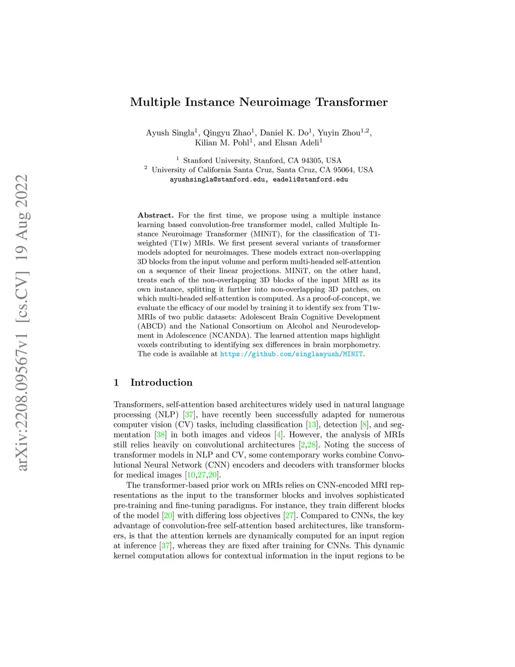 For the first time, we propose using a multiple instance learning based convolution-free transformer model, called Multiple Instance Neuroimage Transformer (MINiT), for the classification of T1weighted (T1w) MRIs. We first present several variants of transformer models adopted for neuroimages. These models extract non-overlapping 3D blocks from the input volume and perform multi-headed self-attention on a sequence of their linear projections. MINiT, on the other hand, treats each of the non-overlapping 3D blocks of the input MRI as its own instance, splitting it further into non-overlapping 3D patches, on which multi-headed self-attention is computed. As a proof-of-concept, we evaluate the efficacy of our model by training it to identify sex from T1w-MRIs of two public datasets: Adolescent Brain Cognitive Development (ABCD) and the National Consortium on Alcohol and Neurodevelopment in Adolescence (NCANDA). The learned attention maps highlight voxels contributing to identifying sex differences in brain morphometry. The code is available at https://github.com/singlaayush/MINIT.