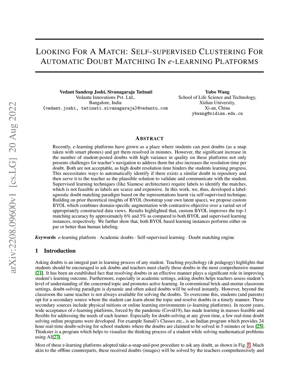 Recently, e-learning platforms have grown as a place where students can post doubts (as a snap taken with smart phones) and get them resolved in minutes. However, the significant increase in the number of student-posted doubts with high variance in quality on these platforms not only presents challenges for teachers' navigation to address them but also increases the resolution time per doubt. Both are not acceptable, as high doubt resolution time hinders the students learning progress. This necessitates ways to automatically identify if there exists a similar doubt in repository and then serve it to the teacher as the plausible solution to validate and communicate with the student. Supervised learning techniques (like Siamese architecture) require labels to identify the matches, which is not feasible as labels are scarce and expensive. In this work, we, thus, developed a label-agnostic doubt matching paradigm based on the representations learnt via self-supervised technique. Building on prior theoretical insights of BYOL (bootstrap your own latent space), we propose custom BYOL which combines domain-specific augmentation with contrastive objective over a varied set of appropriately constructed data views. Results highlighted that, custom BYOL improves the top-1 matching accuracy by approximately 6\% and 5\% as compared to both BYOL and supervised learning instances, respectively. We further show that both BYOL-based learning instances performs either on par or better than human labeling.