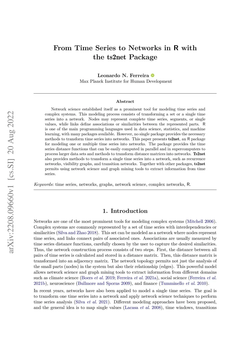 Network science established itself as a prominent tool for modeling time series and complex systems. This modeling process consists of transforming a set or a single time series into a network. Nodes may represent complete time series, segments, or single values, while links define associations or similarities between the represented parts. R is one of the main programming languages used in data science, statistics, and machine learning, with many packages available. However, no single package provides the necessary methods to transform time series into networks. This paper presents ts2net, an R package for modeling one or multiple time series into networks. The package provides the time series distance functions that can be easily computed in parallel and in supercomputers to process larger data sets and methods to transform distance matrices into networks. Ts2net also provides methods to transform a single time series into a network, such as recurrence networks, visibility graphs, and transition networks. Together with other packages, ts2net permits using network science and graph mining tools to extract information from time series.