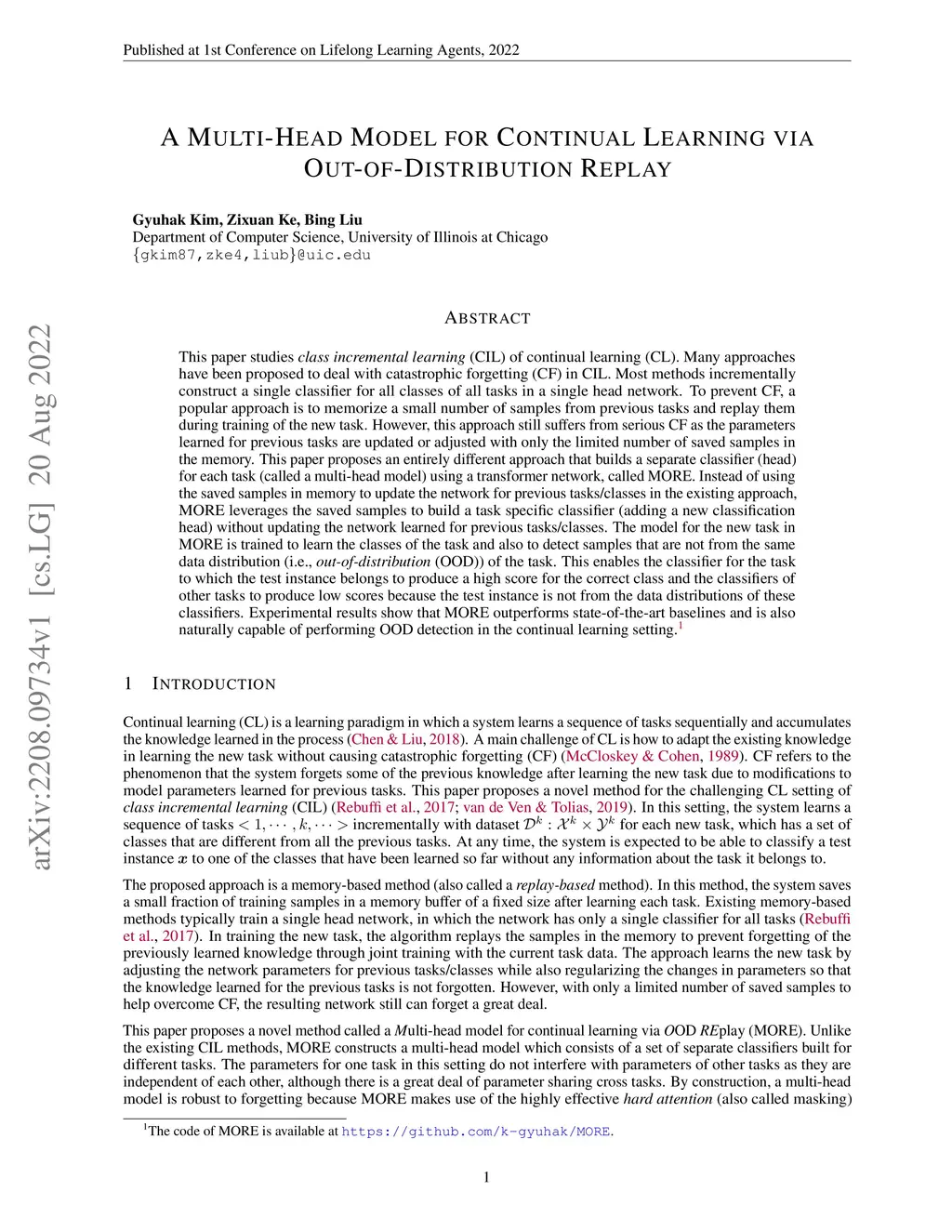 This paper studies class incremental learning (CIL) of continual learning (CL). Many approaches have been proposed to deal with catastrophic forgetting (CF) in CIL. Most methods incrementally construct a single classifier for all classes of all tasks in a single head network. To prevent CF, a popular approach is to memorize a small number of samples from previous tasks and replay them during training of the new task. However, this approach still suffers from serious CF as the parameters learned for previous tasks are updated or adjusted with only the limited number of saved samples in the memory. This paper proposes an entirely different approach that builds a separate classifier (head) for each task (called a multi-head model) using a transformer network, called MORE. Instead of using the saved samples in memory to update the network for previous tasks/classes in the existing approach, MORE leverages the saved samples to build a task specific classifier (adding a new classification head) without updating the network learned for previous tasks/classes. The model for the new task in MORE is trained to learn the classes of the task and also to detect samples that are not from the same data distribution (i.e., out-of-distribution (OOD)) of the task. This enables the classifier for the task to which the test instance belongs to produce a high score for the correct class and the classifiers of other tasks to produce low scores because the test instance is not from the data distributions of these classifiers. Experimental results show that MORE outperforms state-of-the-art baselines and is also naturally capable of performing OOD detection in the continual learning setting.