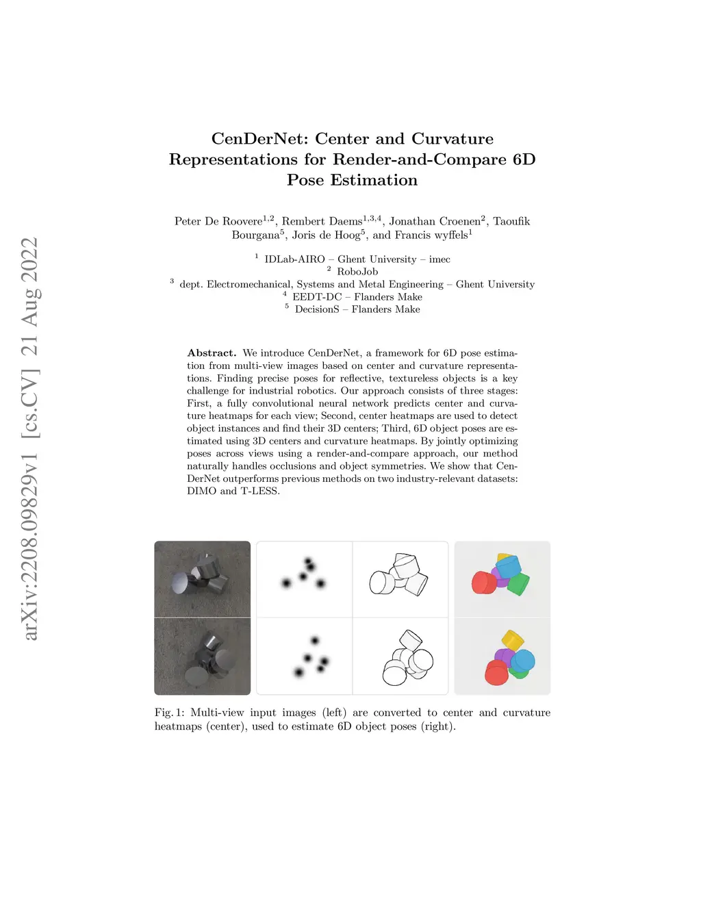 We introduce CenDerNet, a framework for 6D pose estimation from multi-view images based on center and curvature representations. Finding precise poses for reflective, textureless objects is a key challenge for industrial robotics. Our approach consists of three stages: First, a fully convolutional neural network predicts center and curvature heatmaps for each view; Second, center heatmaps are used to detect object instances and find their 3D centers; Third, 6D object poses are estimated using 3D centers and curvature heatmaps. By jointly optimizing poses across views using a render-and-compare approach, our method naturally handles occlusions and object symmetries. We show that CenDerNet outperforms previous methods on two industry-relevant datasets: DIMO and T-LESS.