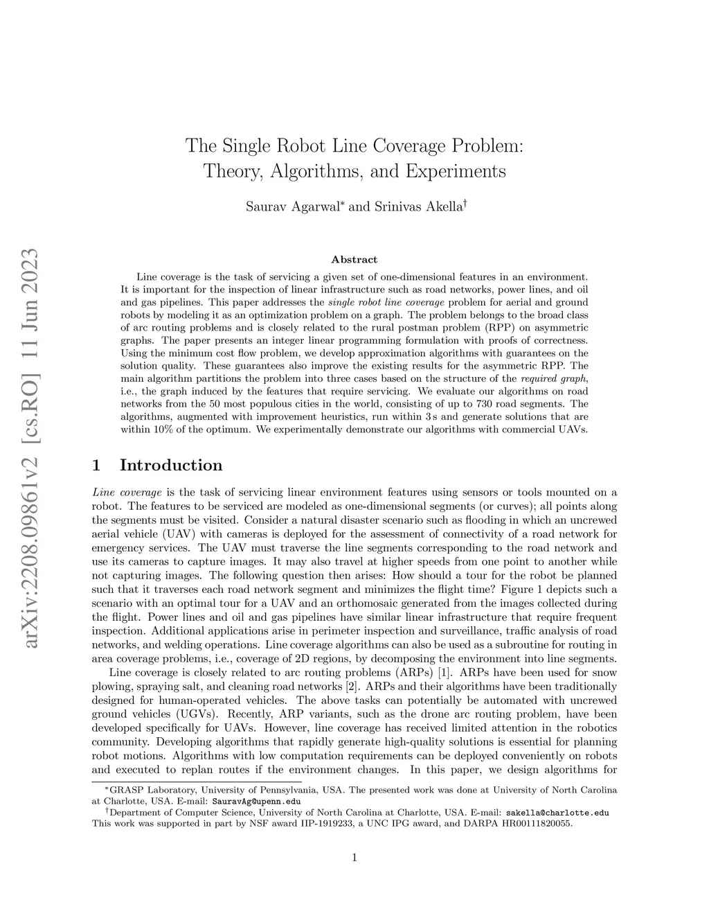 Line coverage is the task of servicing a given set of one-dimensional features in an environment. It is important for the inspection of linear infrastructure such as road networks, power lines, and oil and gas pipelines. This paper addresses the single robot line coverage problem for aerial and ground robots by modeling it as an optimization problem on a graph. The problem belongs to the broad class of arc routing problems and is closely related to the rural postman problem (RPP) on asymmetric graphs. The paper presents an integer linear programming formulation with proofs of correctness. Using the minimum cost flow problem, we develop approximation algorithms with guarantees on the solution quality. These guarantees also improve the existing results for the asymmetric RPP. The main algorithm partitions the problem into three cases based on the structure of the required graph, i.e., the graph induced by the features that require servicing. We evaluate our algorithms on road networks from the 50 most populous cities in the world, consisting of up to 730 road segments. The algorithms, augmented with improvement heuristics, run within 3s and generate solutions that are within 10% of the optimum. We experimentally demonstrate our algorithms with commercial UAVs.