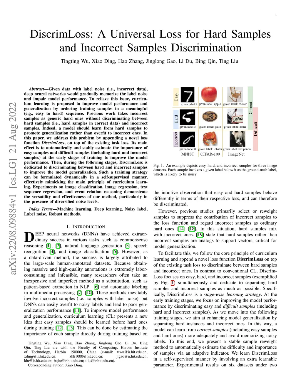 Given data with label noise (i.e., incorrect data), deep neural networks would gradually memorize the label noise and impair model performance. To relieve this issue, curriculum learning is proposed to improve model performance and generalization by ordering training samples in a meaningful (e.g., easy to hard) sequence. Previous work takes incorrect samples as generic hard ones without discriminating between hard samples (i.e., hard samples in correct data) and incorrect samples. Indeed, a model should learn from hard samples to promote generalization rather than overfit to incorrect ones. In this paper, we address this problem by appending a novel loss function DiscrimLoss, on top of the existing task loss. Its main effect is to automatically and stably estimate the importance of easy samples and difficult samples (including hard and incorrect samples) at the early stages of training to improve the model performance. Then, during the following stages, DiscrimLoss is dedicated to discriminating between hard and incorrect samples to improve the model generalization. Such a training strategy can be formulated dynamically in a self-supervised manner, effectively mimicking the main principle of curriculum learning. Experiments on image classification, image regression, text sequence regression, and event relation reasoning demonstrate the versatility and effectiveness of our method, particularly in the presence of diversified noise levels.