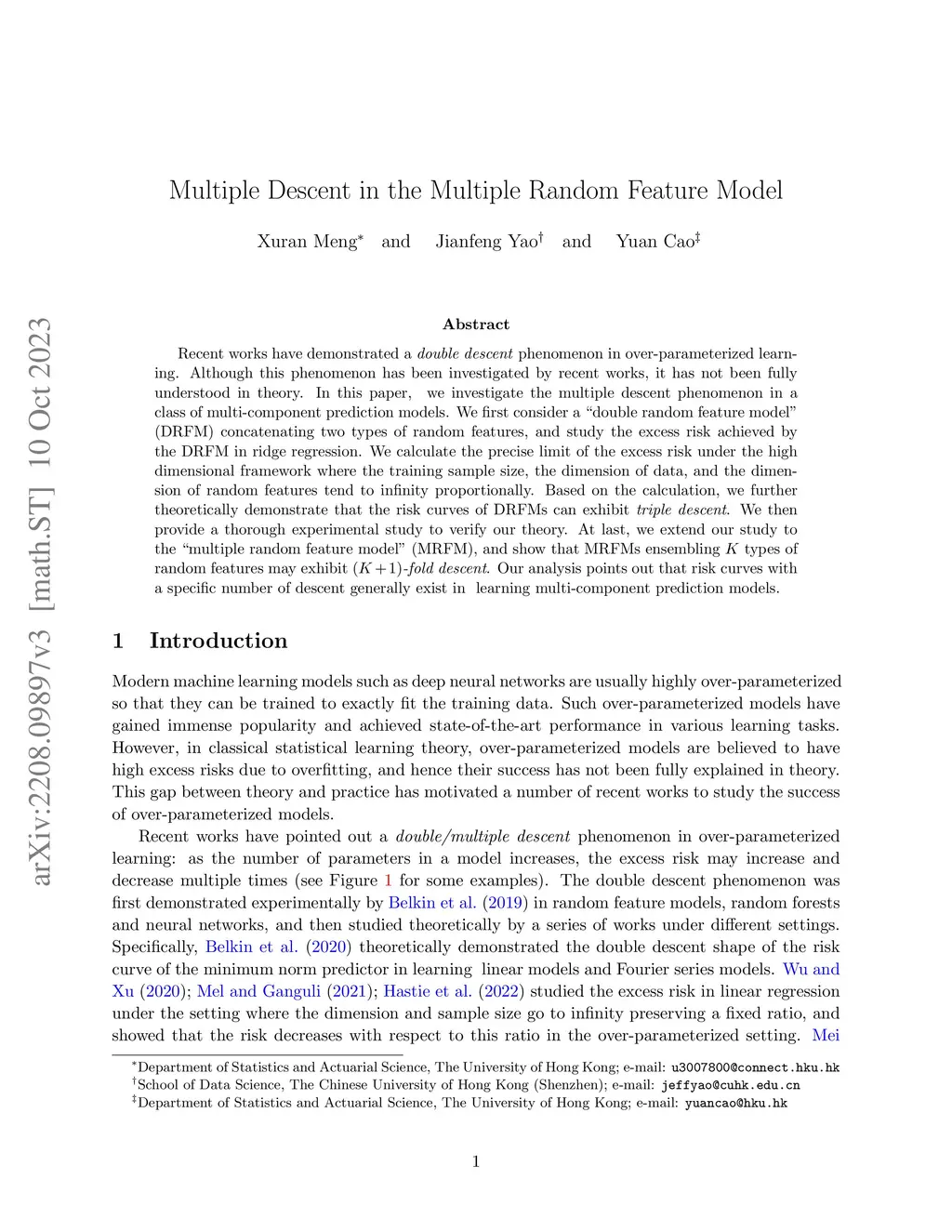 Recent works have demonstrated a double descent phenomenon in over-parameterized learning. Although this phenomenon has been investigated by recent works, it has not been fully understood in theory. In this paper, we investigate the multiple descent phenomenon in a class of multi-component prediction models. We first consider a ''double random feature model'' (DRFM) concatenating two types of random features, and study the excess risk achieved by the DRFM in ridge regression. We calculate the precise limit of the excess risk under the high dimensional framework where the training sample size, the dimension of data, and the dimension of random features tend to infinity proportionally. Based on the calculation, we further theoretically demonstrate that the risk curves of DRFMs can exhibit triple descent. We then provide a thorough experimental study to verify our theory. At last, we extend our study to the ''multiple random feature model'' (MRFM), and show that MRFMs ensembling types of random features may exhibit -fold descent. Our analysis points out that risk curves with a specific number of descent generally exist in learning multi-component prediction models.