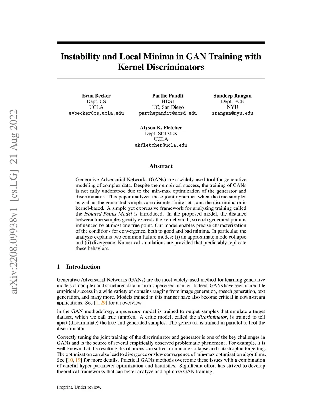 Generative Adversarial Networks (GANs) are a widely-used tool for generative modeling of complex data. Despite their empirical success, the training of GANs is not fully understood due to the min-max optimization of the generator and discriminator. This paper analyzes these joint dynamics when the true samples, as well as the generated samples, are discrete, finite sets, and the discriminator is kernel-based. A simple yet expressive framework for analyzing training called the is introduced. In the proposed model, the distance between true samples greatly exceeds the kernel width, so each generated point is influenced by at most one true point. Our model enables precise characterization of the conditions for convergence, both to good and bad minima. In particular, the analysis explains two common failure modes: (i) an approximate mode collapse and (ii) divergence. Numerical simulations are provided that predictably replicate these behaviors.